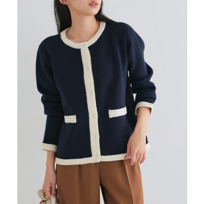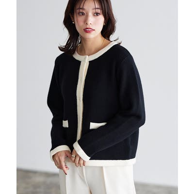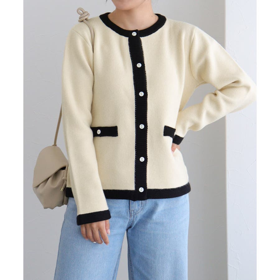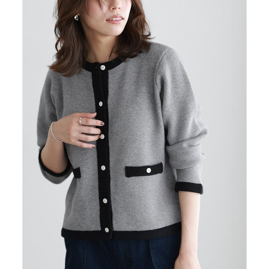 アクセントになった配色使いがクラシカルな雰囲気に。コンパクトな着丈ですっきりと上品に仕上げました。ニットなのでジャケットよりもデイリー使いしやすく、ON/OFF問わず着用頂けるアイテムです。