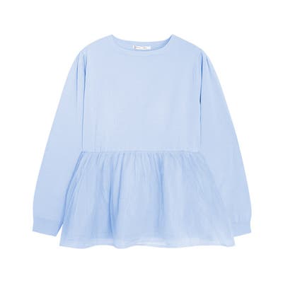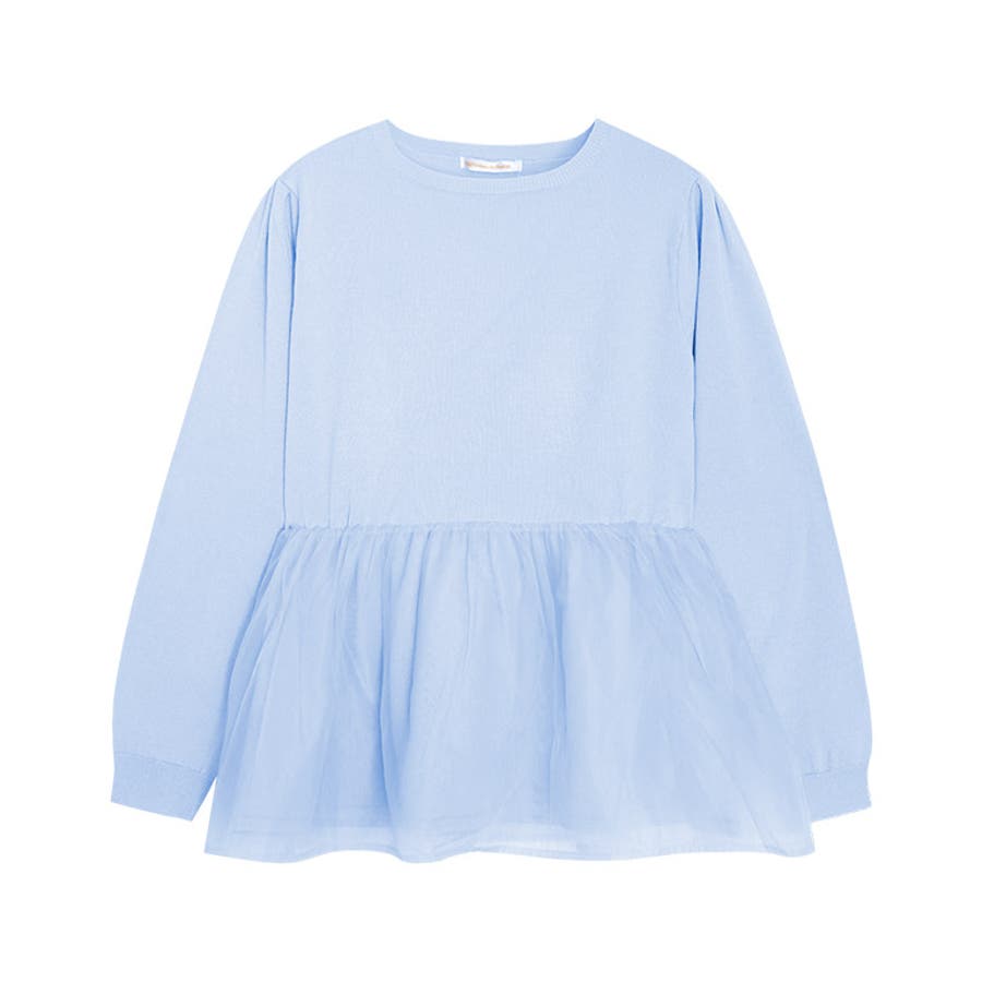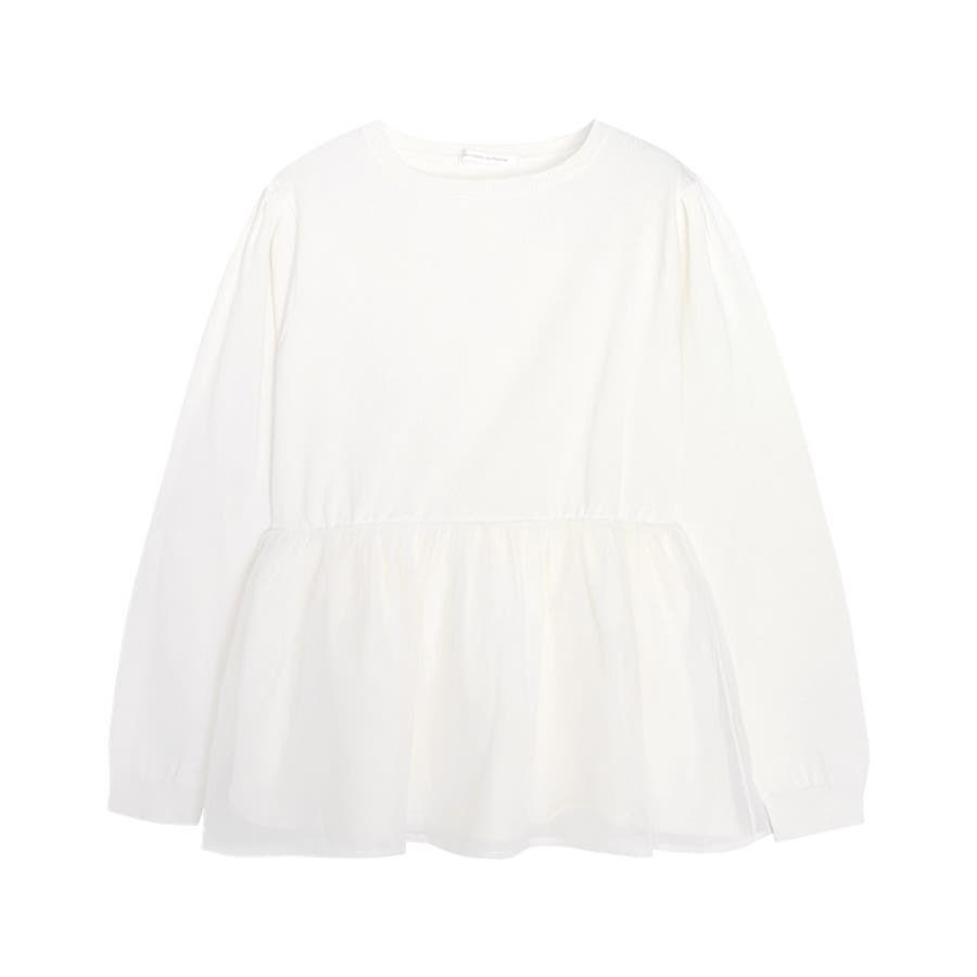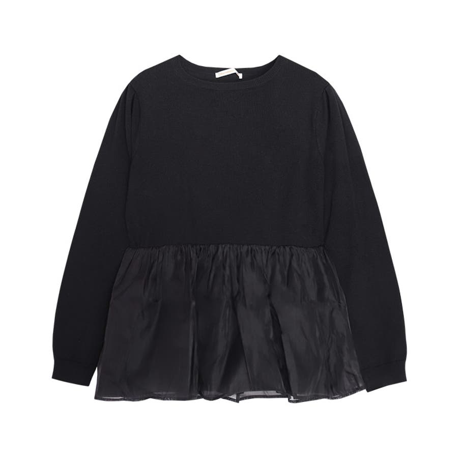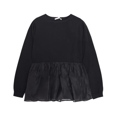 柔らかい肌触りが魅力的なレーヨン混のニット素材で裾にオーガンジーをドッキングさせた一枚で着映え感のあるニット。