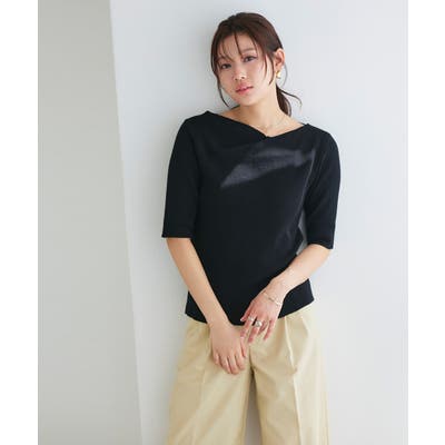襟元のドレープ風デザインが上品で顔周りをすっきりした印象にしてくれます。ざっくりしているのでボトムスを選ばず、シンプルで女性らしいデザインです。