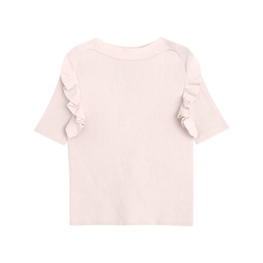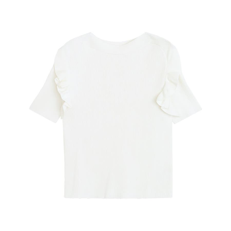 肩部分を少しカットすることで、大人でもチャレンジしやすい肌見せに。袖に施したフリルがスタイリングにフェミニンさプラスさせ、女性らしい一枚に仕上げました。