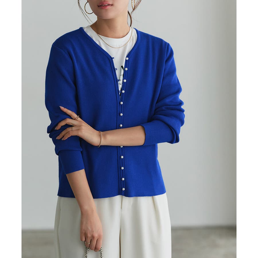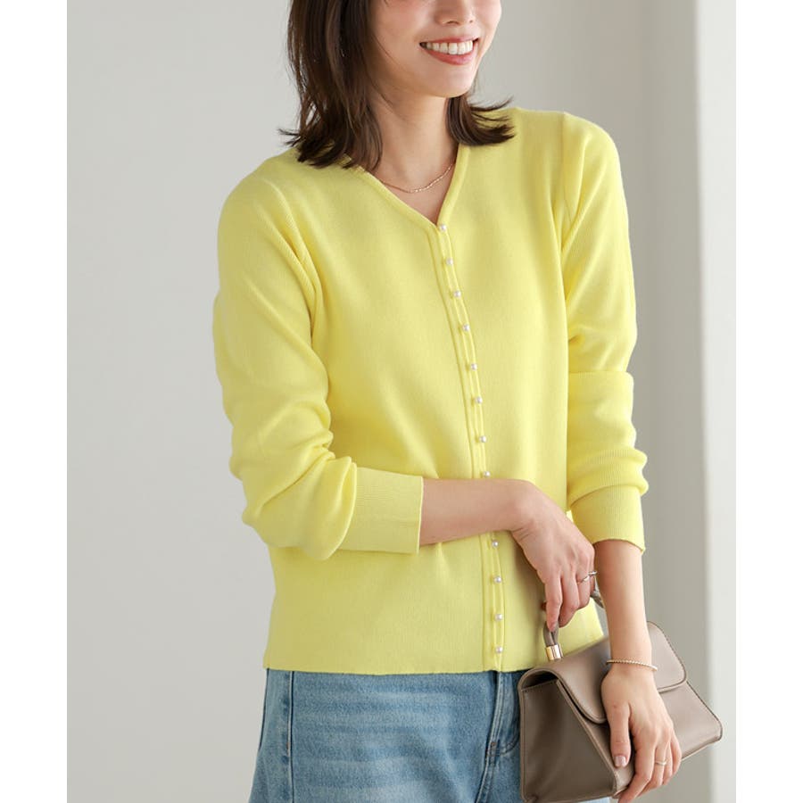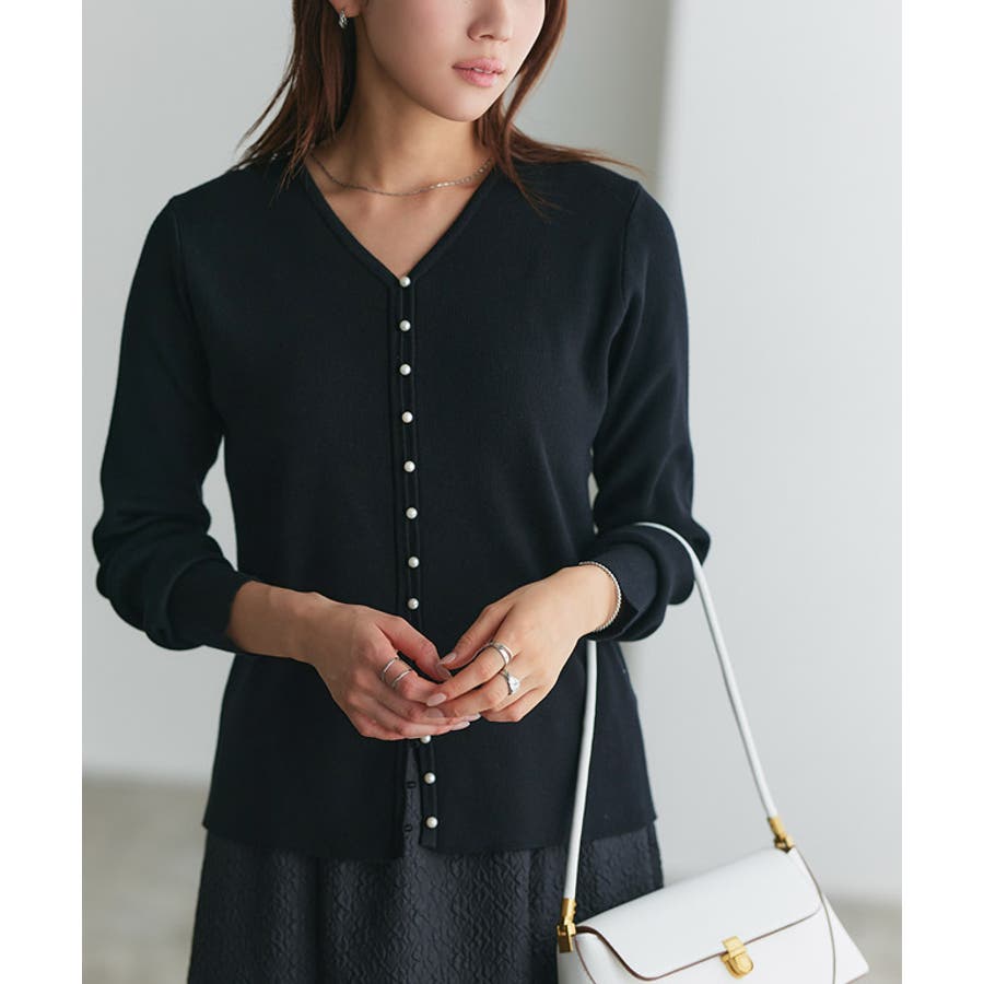 小さなイミテーションパールがアクセントのシンプルなカーディガン。Vネック仕様でデコルテラインをきれいに見せてくれます。