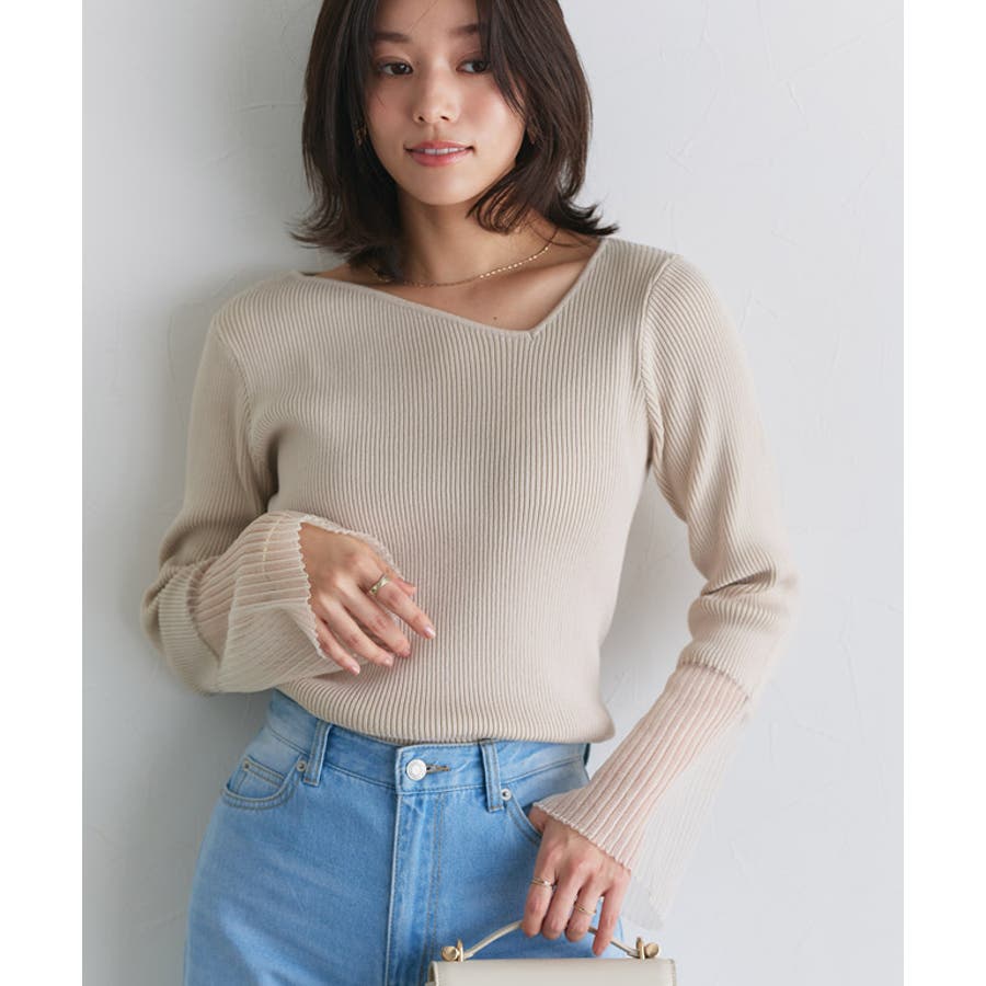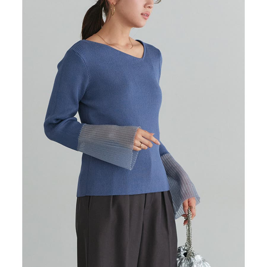 袖シアー切り替えアシメネックリブニット ニット リブ