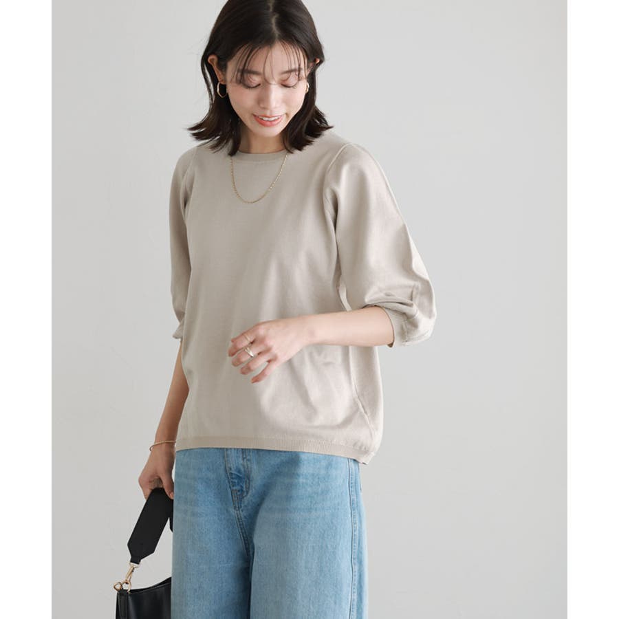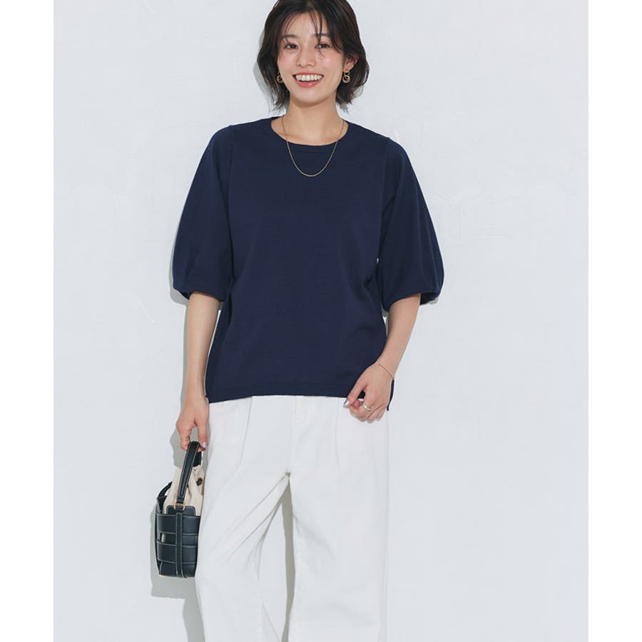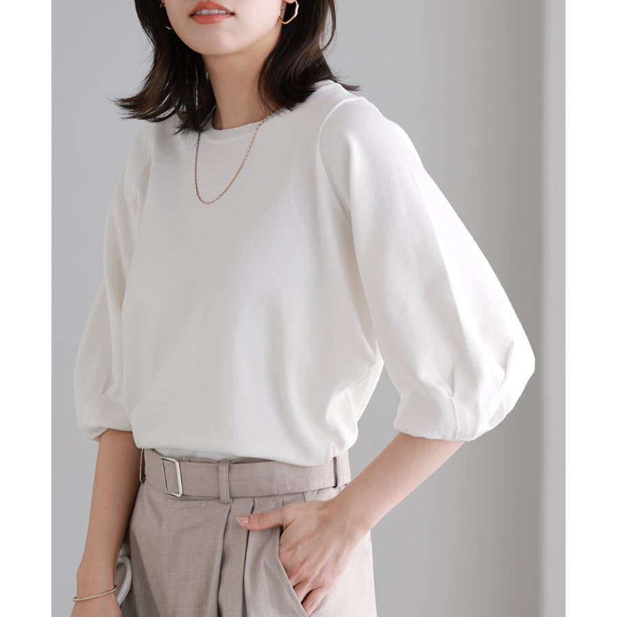 構築スリーブとシンプルでゆとりのある身頃で、華奢見えするメリハリあるシルエットに。 袖は6分丈なので重くなりすぎず、少したくし上げることでボリューム感もプラスします。
