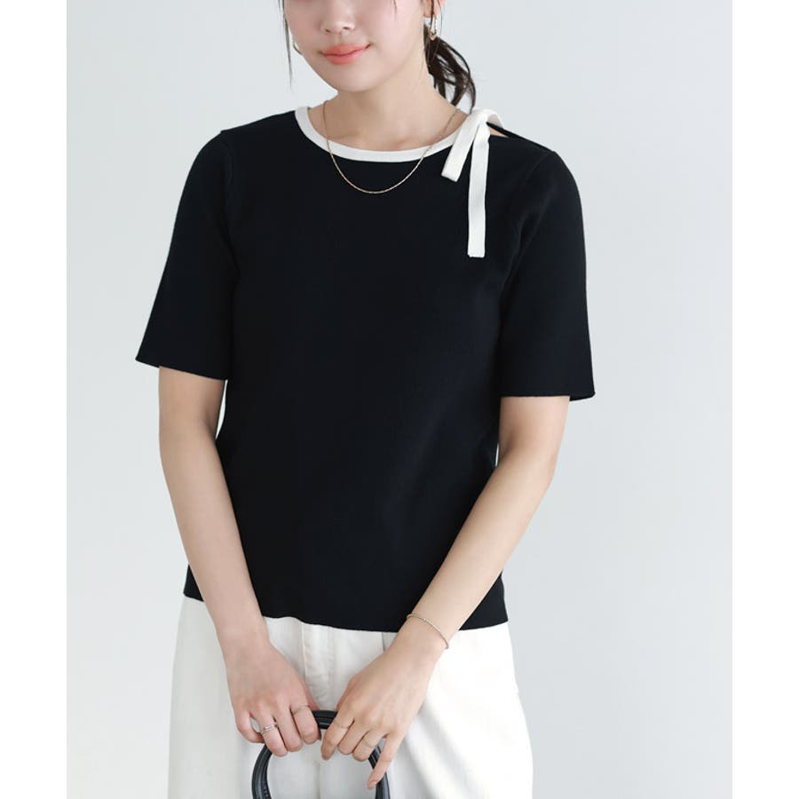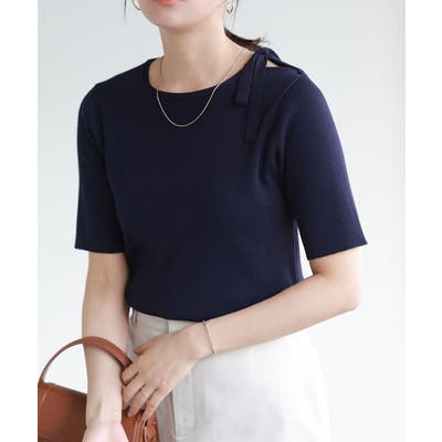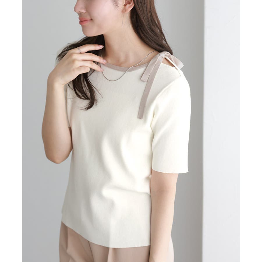 肩にリボンをあしらい、さりげなくオープンショルダーにすることで抜け感をプラス。女性らしい印象のニットに仕上げました。
