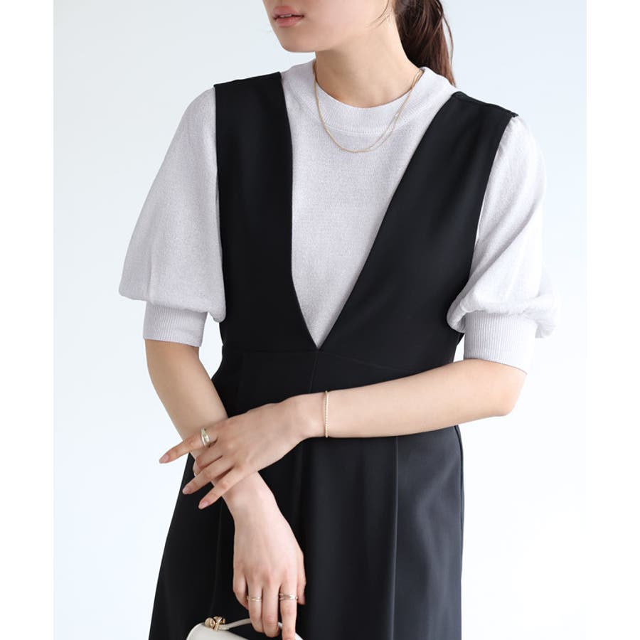 袖にボリュームを持たせたデザインがシンプルながらフェミニンな印象に導いてくれます。気になる二の腕を自然にカバーしてくれるところも嬉しいポイント。薄手のニット素材なので、ジャンスカやキャミワンピースなどのインナーにもお使いいただけます。