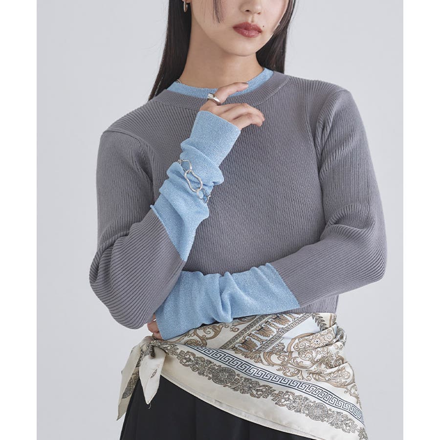 レーヨン混のやわらかな風合いが上品なニット素材。細めのリブ編みが表情をプラスします。袖とネックの配色部分は程よい透け感のラメ素材でアクセントをプラス。