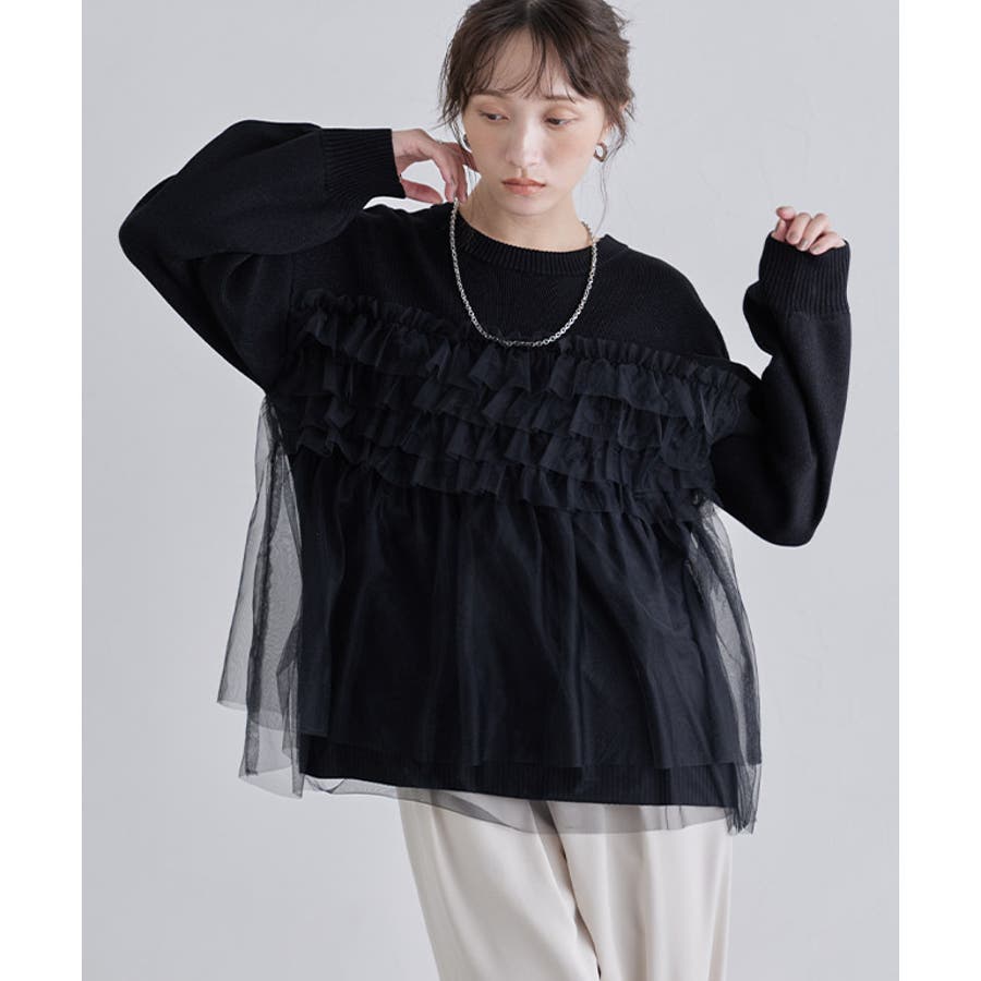 ニットの上にチュールを贅沢に重ねた、着映え感抜群のニットプルオーバー。ゆったりとしたシルエットとドロップショルダーでこなれ感を演出しつつ体型カバーも叶えます。
