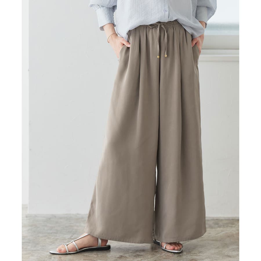 裾に向かって広がるワイドシルエットが、動くたび軽やか見えするサマーパンツ。脚のラインを拾わずヒップや太ももをさりげなくカバーし、安心感も抜群。ウエストはゴム仕様で窮屈感なく着用でき、リボン先端のゴールドパーツが高見えポイントに。デイリーシーンに着回しの効く優秀な一枚です。