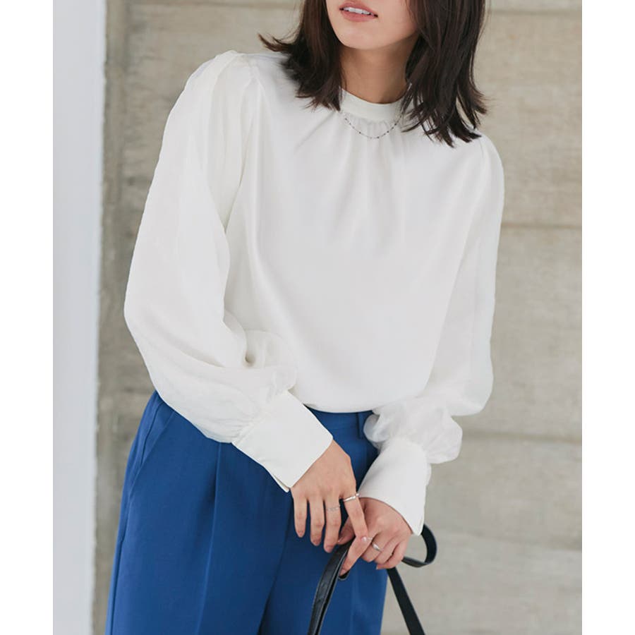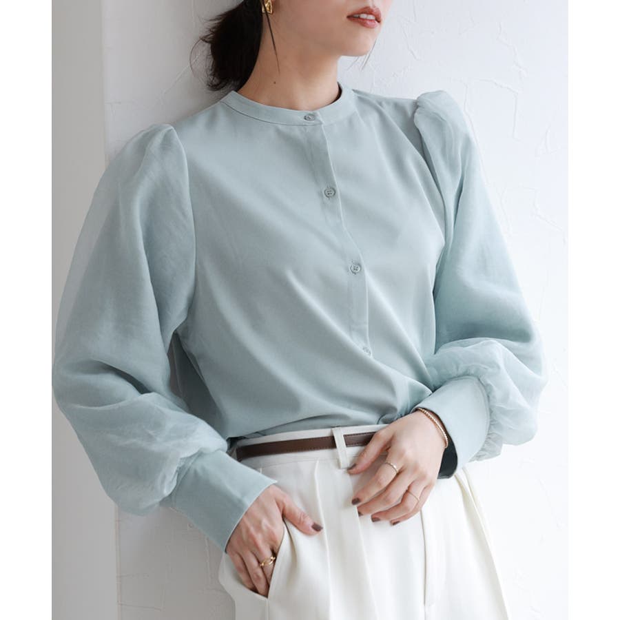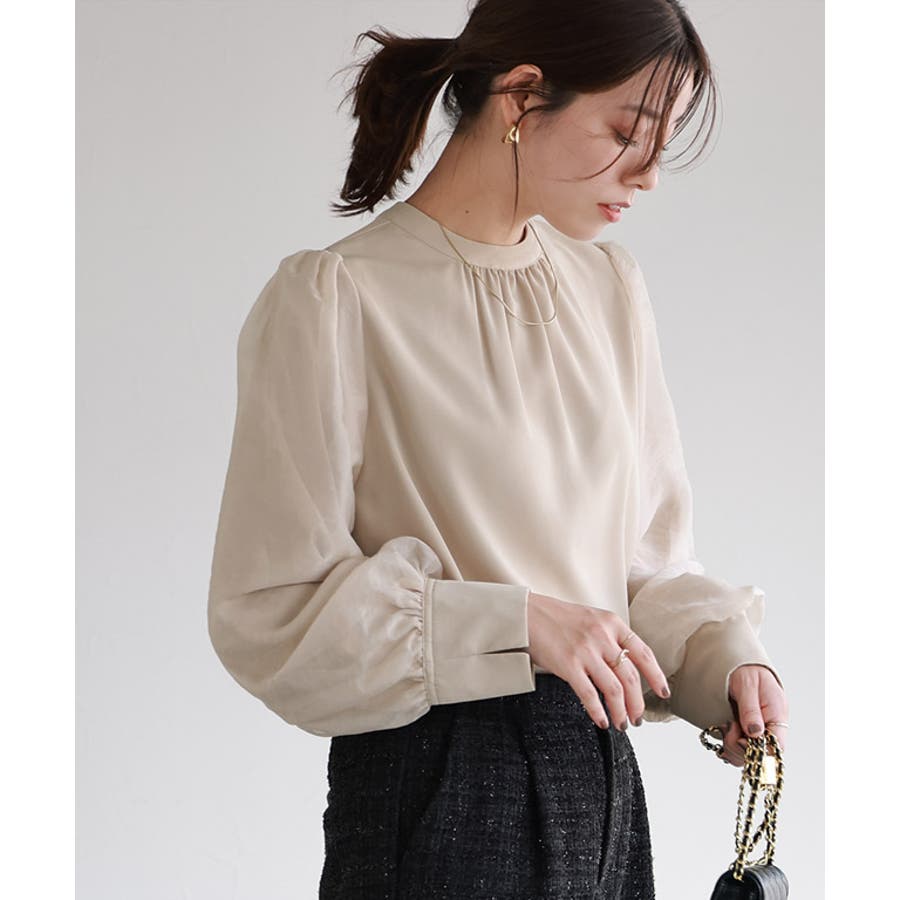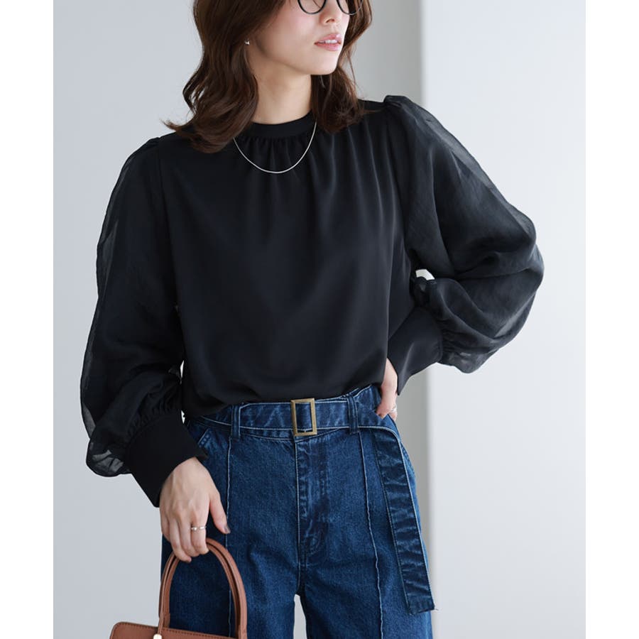 袖部分に重ねたオーガンジーがフェミニン感を引き立てるデザインブラウス。ボリュームのある袖デザインが女性らしい印象をプラスします。印象を変えられる前後2way仕様で着こなしの幅が広がるところも魅力の一つ。