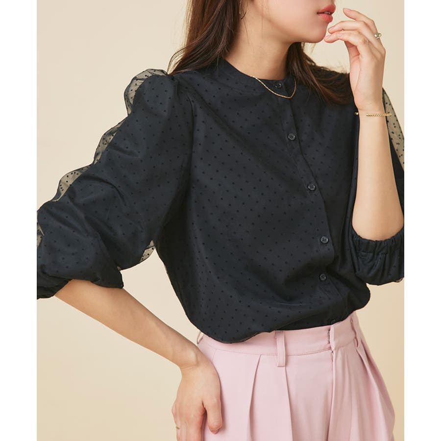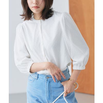 袖のパフデザインがトレンド感のあるブラウス。丸みのあるシルエットが女性らしさ漂う一枚。前立て仕様なので、ボトムはパンツですっきりと合わせるスタイルがおすすめです。
