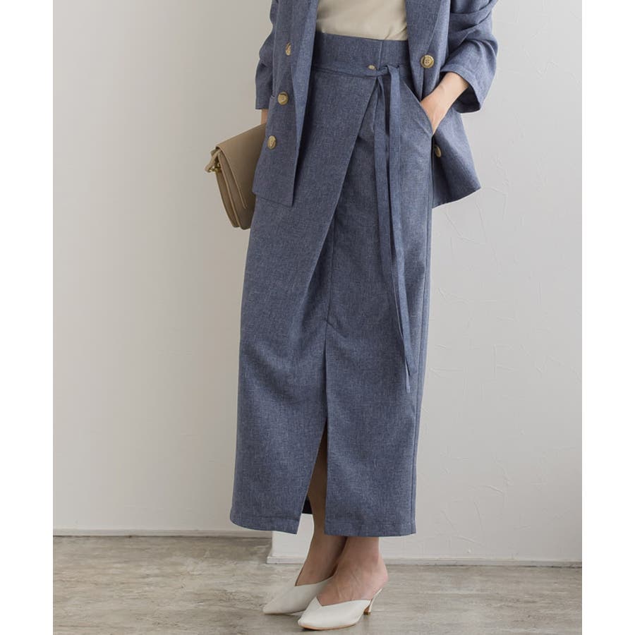 ラップデザインがシンプルながらこなれ感のあるスタイリングに仕上げ、スタイルアップ効果も叶える一枚。ウエストはヒモで調節ができるのも嬉しいポイントです。同素材のアウターとのセットアップ着用もおすすめです。