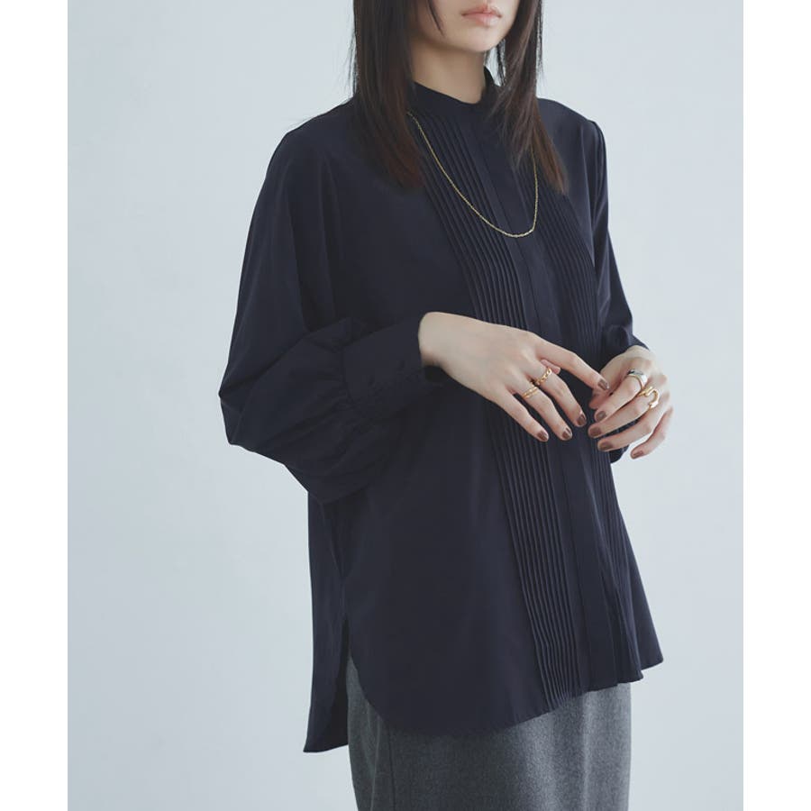 首元から裾まで施された繊細なピンタックが顔周りを華やかな印象に導くデザイン。ギャザーをたっぷりと施したボリューム袖とロングカフスのコントラストがメリハリのあるシルエットに導きます。カフスにはクルミ釦でアクセントをプラス。袖口のシャーリングにはゴムが入っているため楽にたくし上げられるところも魅力のひとつです。
