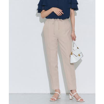フロント部分はギャザーを寄せない仕様なので前をインしても綺麗に穿けます。腰回りはゆったり、裾はすっきりした美脚を叶えるテーパードシルエットに。センタープレスラインでより脚長効果も。ウエストは紐付きなので簡単にサイズ調整ができ、先端のシルバーチップで上品に仕立てました。