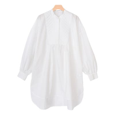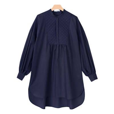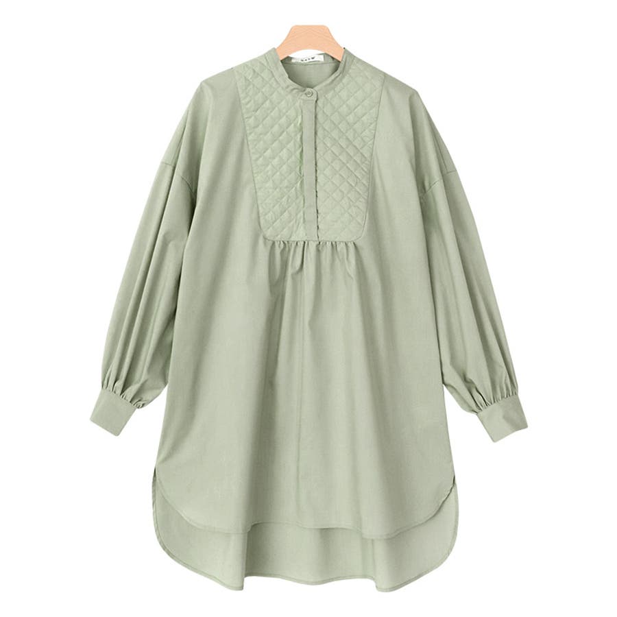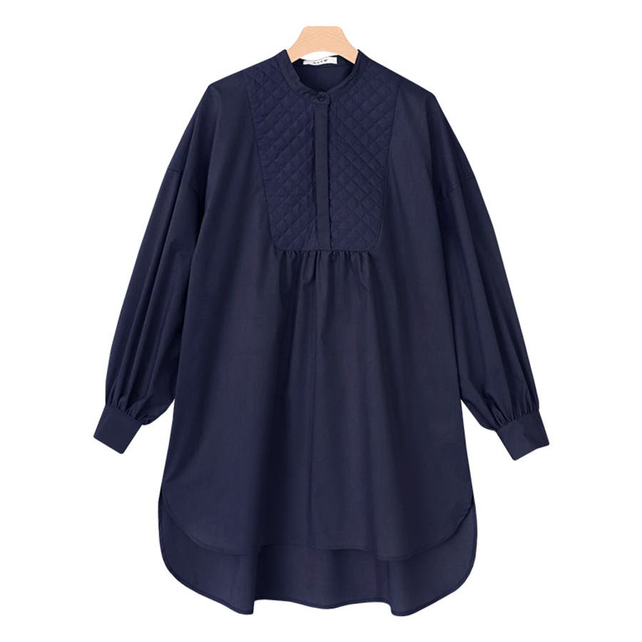 胸元のブザム切り替えがトレンド感のあるデザイン。キルティングにすることでシンプルな中にもアクセントを効かせた一枚です。バンドカラーですっきりとクラシカルな印象に。前後差のついた長め丈が、腰まわりやヒップラインをカバーしつつ、サイドスリットで抜け感を表現。ボトムアウトの着こなしで今季らしいバランスに。シンプルなデニム合わせはもちろん、ワイドボトムスやフレアパンツとも相性抜群です。バックにはたっぷりとったギャザーでボリューム感を持たせ、女性らしい印象のシルエットに仕上げました。