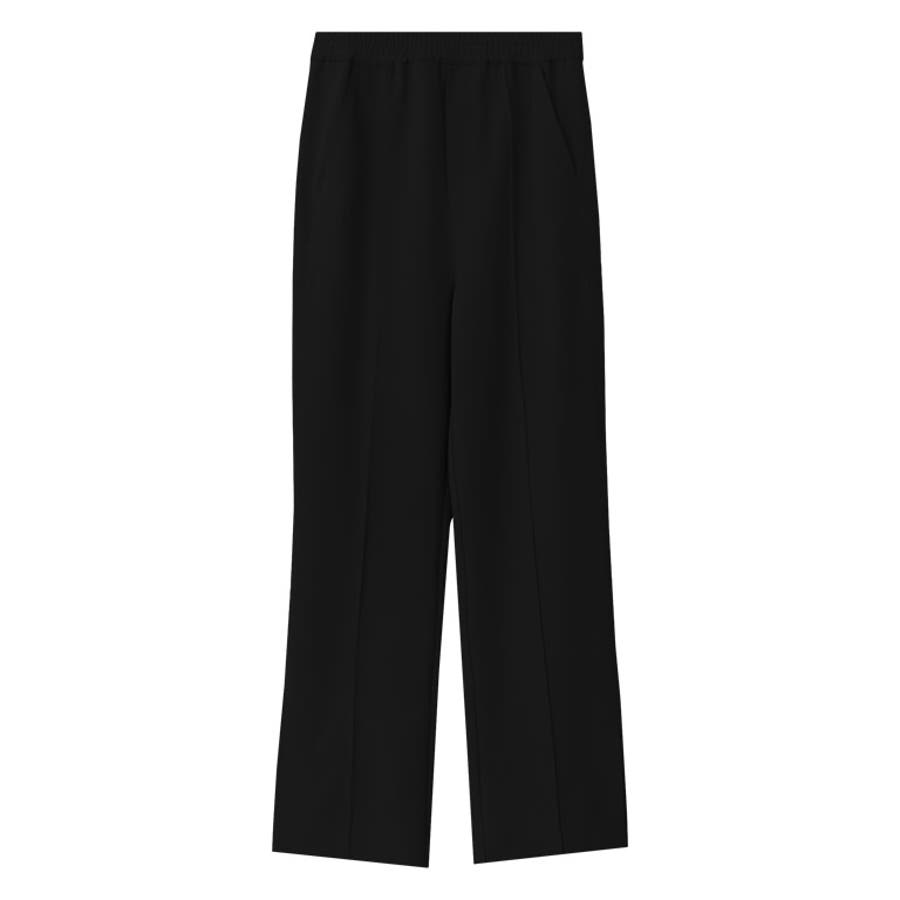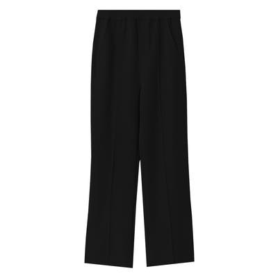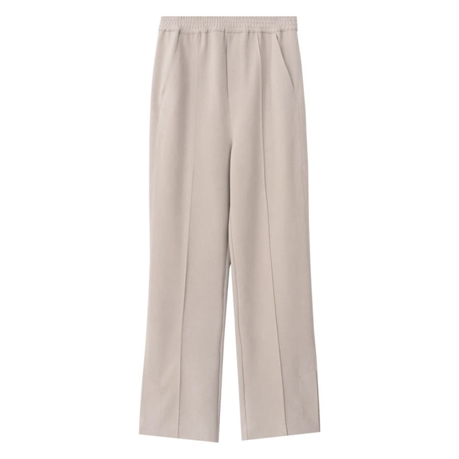 脚のラインを美しく見せるストレートシルエットパンツ。センターピンタックとサイドラインを内側にしたパターンで視覚的に足がすっきり見え、美脚効果を叶えます。ウエストゴムでストレスフリーな着心地です。裾に施したベンツスリットは、全体にアクセントをプラスし、歩くたびに表情を与えてくれるデザインです。