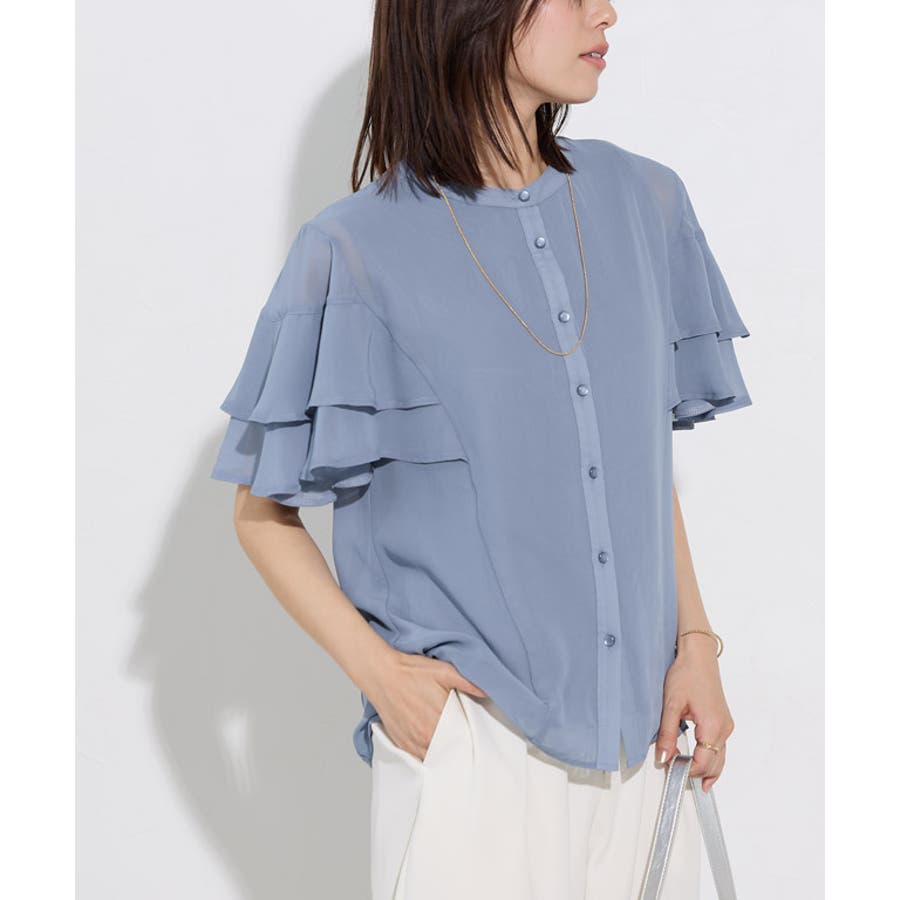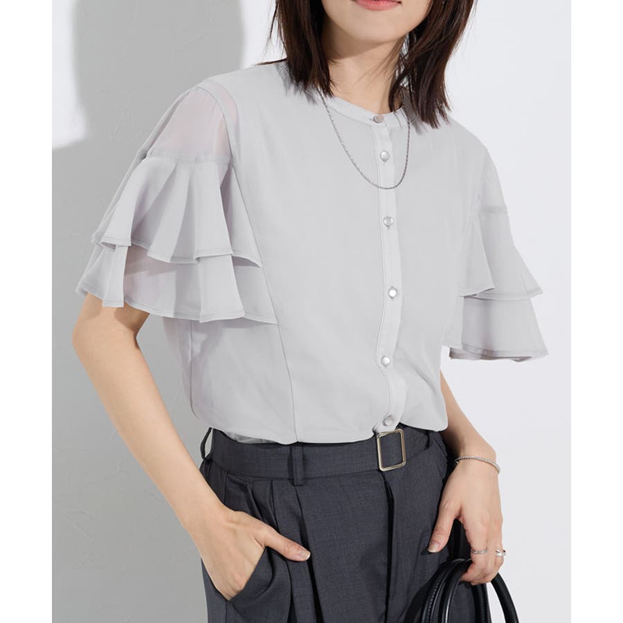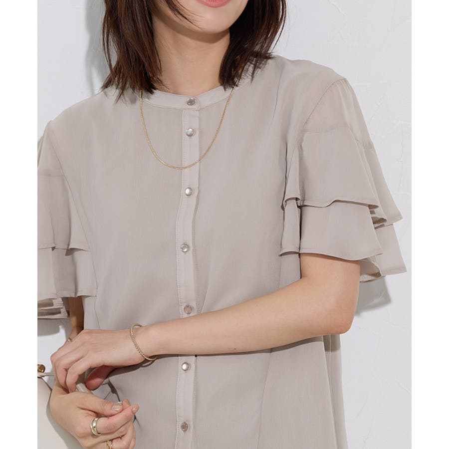 ふんわりティアードスリーブが二の腕を カバーし、華やかで軽やかな印象に。 上品なフロントボタン×ノーカラーで 抜け感もプラス。パンツにもスカートにも 合わせやすく、ON/OFFで活躍する一枚です。
