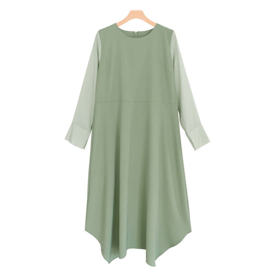 前のシルエットはシンプルに、後ろのウエスト部分にタックを施すことで、体型カバーも叶えてくれるデザインに。袖にはシーズンムードが漂うシアー素材に、袖口をカフスにすることで、一枚でもレイヤードでも様見えするようにこだわりました。
