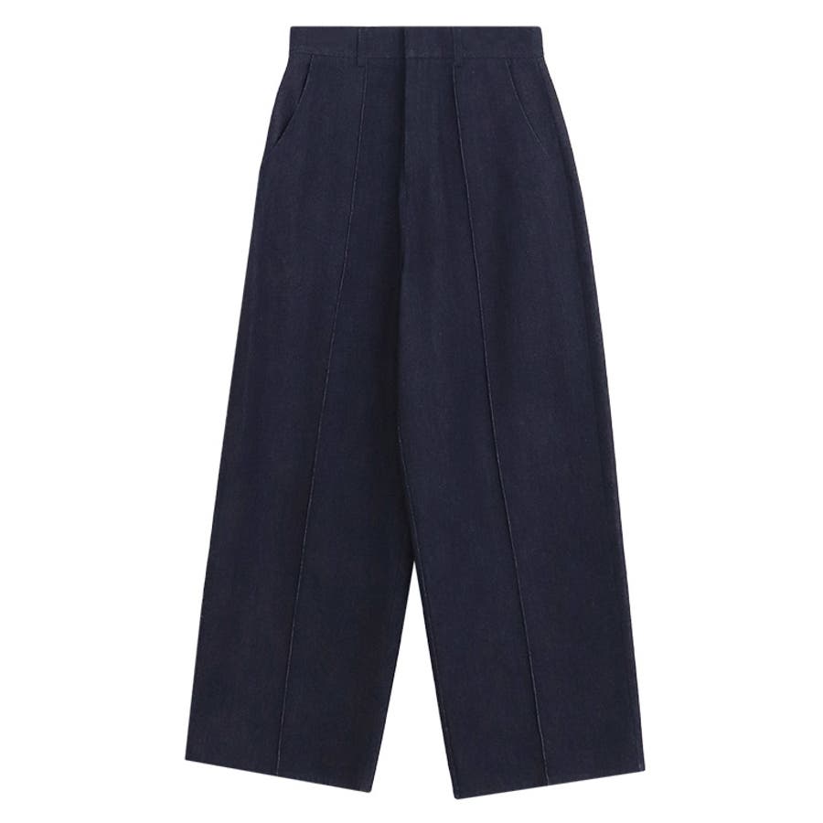 スラックスのパターンで仕立てたデニムパンツ。カジュアルな素材ながらも、上品さのあるデザインに仕上げました。センターのピンタックが足のラインをきれいに見せてくれ、きちんと感のある印象に。お洗濯で消えないところも魅力の一つです。すとんとしたストレートラインで落ち着いた大人な雰囲気へと導きます。