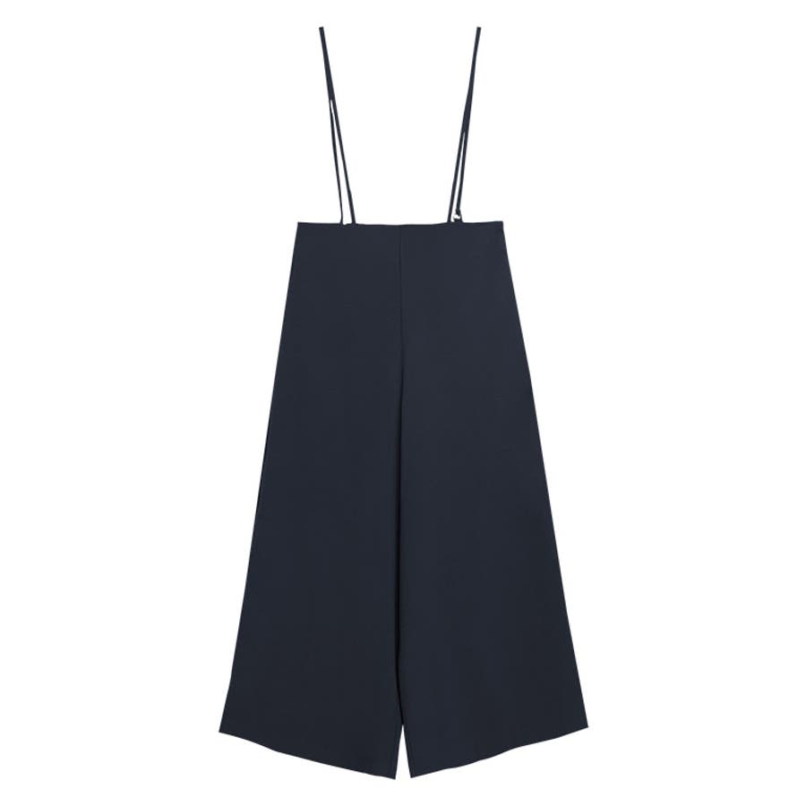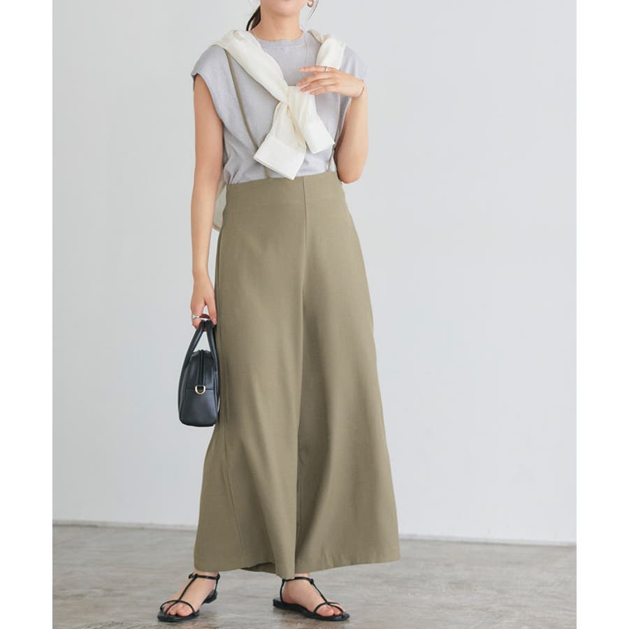 華奢なストラップが主張しすぎず、お好みの長さに変えることができ、ハイウエストにすると足長効果も◎足のラインを拾いにくいリラクシーなサイズ感で楽なのに、ステッチが見えない仕様にしているので、きれい見えする一枚です。