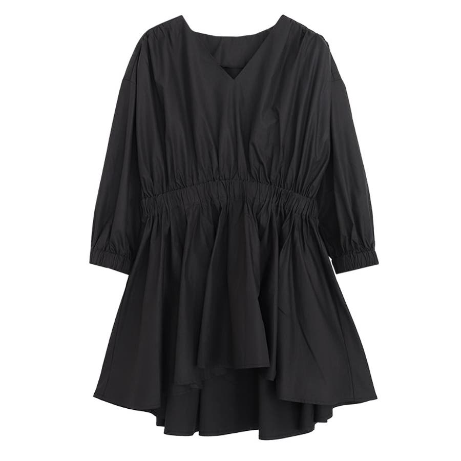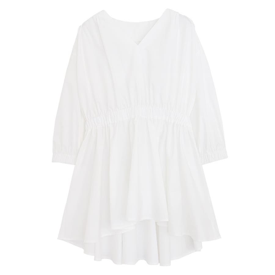 ウエストに施されたたっぷりのギャザーがアクセントになり、ボリューム感のあるフレアデザインがポイントです。また、ヒップ周りをさりげなく隠してくれるところも魅力の一つです。ロングテールデザインがバックスタイルも女性らしさ溢れる一枚となっています。