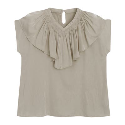 顔周りを華やかな印象に導いてくれるフリルカラーデザイン。フリルには繊細なシャーリングを施し、こだわりの詰まった一枚です。程良く開いたVネックラインがフェミニンなデザインの中にもすっきりとした印象をプラスしてくれます。