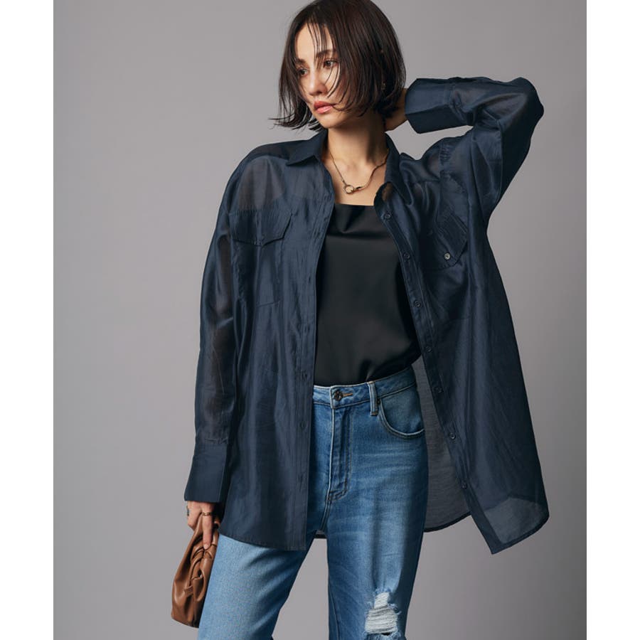 腰周りもカバーしてくれる長めの丈感がゆったりとした着心地でリラクシーな印象に。メンズライクなヨークデザインやフラップポケットでカジュアルな要素を加えつつ、シアー素材で女性らしい抜け感をプラスしました。釦を留め変えるとカシュクールにもなるデザインで着こなしの幅も広がる一枚です。