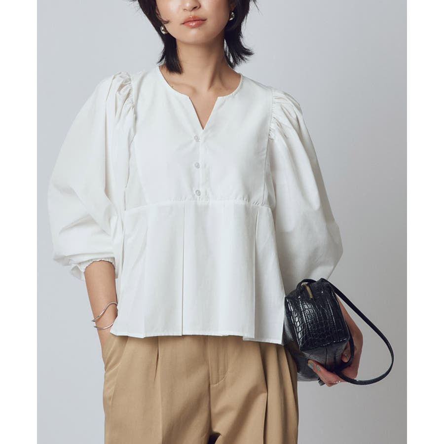 たっぷりとボリュームをとった袖のデザインとコンパクトな丈感がメリハリのあるシルエットを演出。ウエストから切り替えられたプリーツデザインがシャープな印象を加え、フェミニンなディテールながらもミニマルに着用頂ける一枚です。デコルテ周りはキーネックラインとシェル釦のアクセントで抜け感をプラスしました。