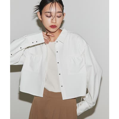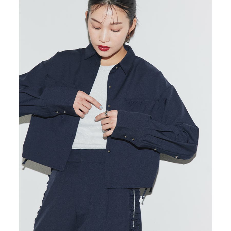 フロントと袖部分に施したメタルスタッズがコーデのアクセントに。サイドはドロストデザインの2way仕様でお好みのシルエットに調整が可能です。短めの着丈でトレンドライクな一枚。