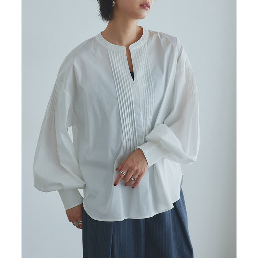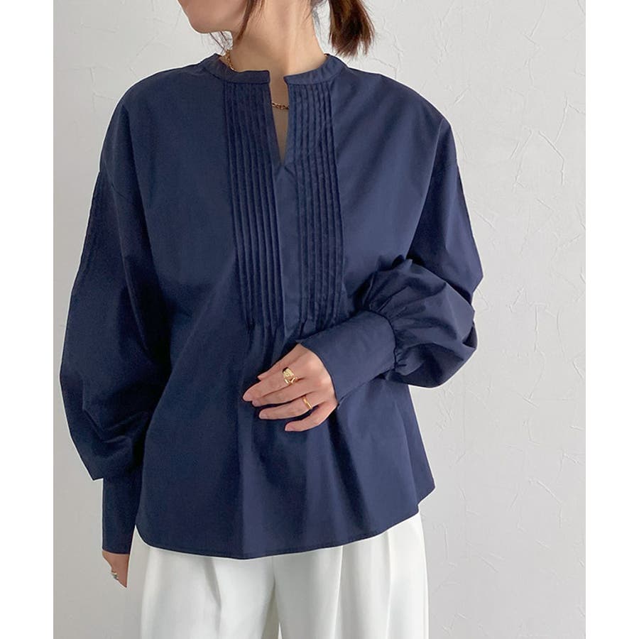 胸元のピンタックがシャープな印象を持たせつつ、ボリュームスリーブで女性らしさ溢れるデザイン。ボリューム感のあるシルエットの中に、首元に入ったスリットで大人の抜け感をプラス。袖口は窮屈感のないシャーリングカフスを採用し、細部までこだわりの詰まったデザインブラウスです。