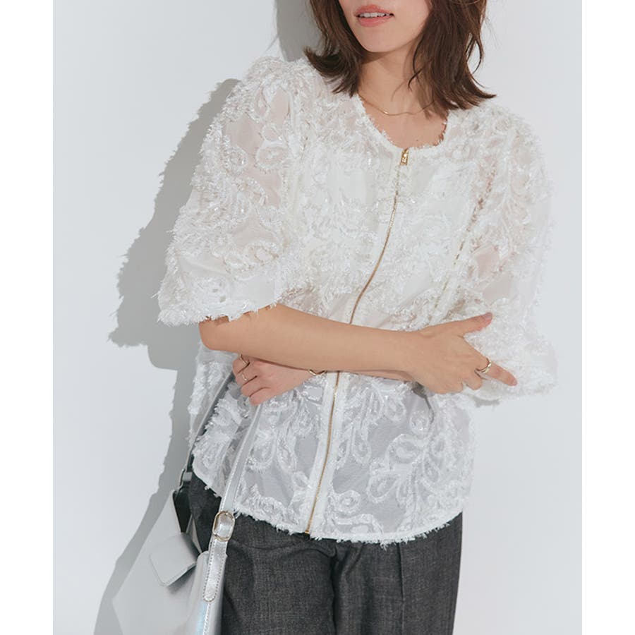 デザインが華やかで一枚で着映えるデザイン。やや広がりのあるボリュームスリーブで、手首が華奢見えします。ジップデザインで前後着用できるのも魅力ポイント。