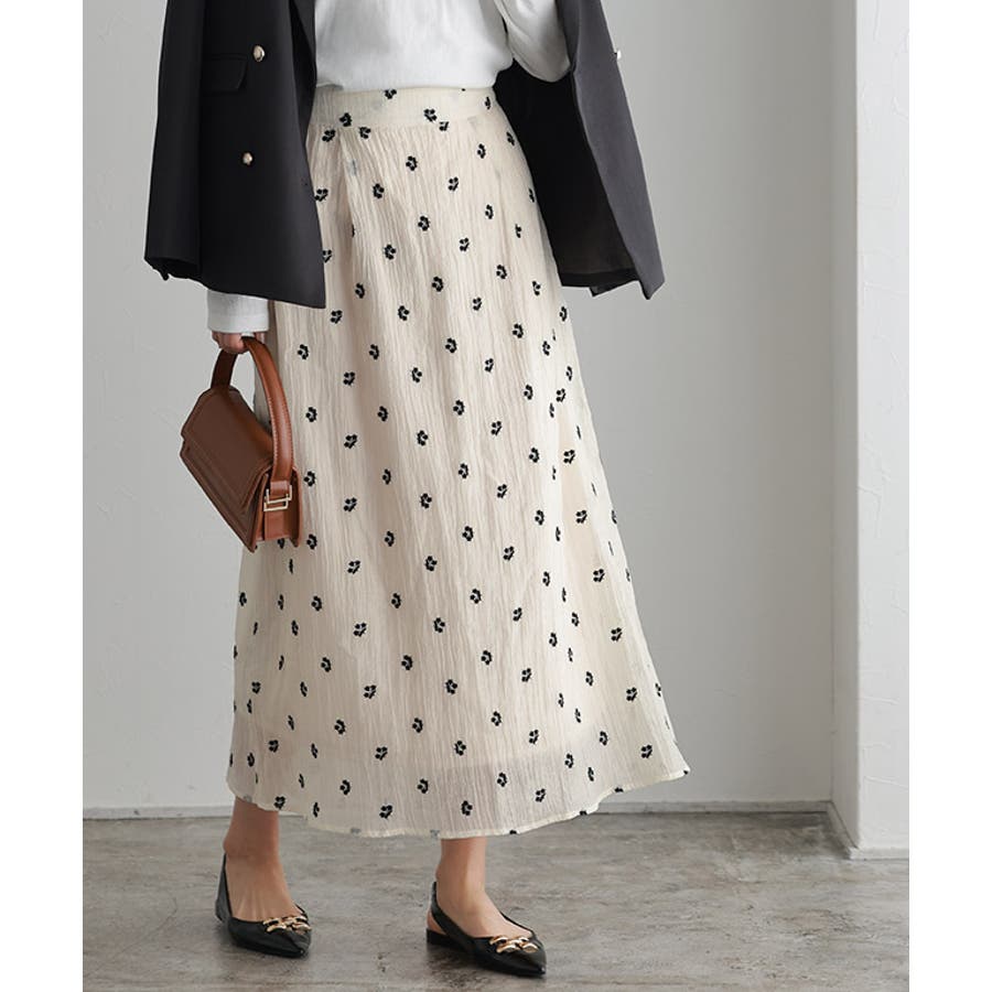 キャッチーな刺繍が施された、ワッシャー素材。シンプルなトップスに合わせるだけで華やかさをプラスしてくれます。柔らかな印象のアイボリーと甘くなり過ぎないブラックの2色展開で、ベースカラーによって異なる雰囲気に。