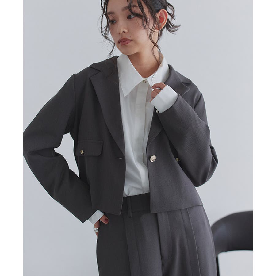 コンパクトな丈感が魅力のトレンド感漂うクロップドジャケット。フロントにあしらったゴールドボタンが上品なアクセントとしてスタイリングを格上げしてくれます。肩や身幅は程よくゆとりを持たせこなれた抜け感を演出。シャツやブラウスともバランスが取りやすく、きれいめにもカジュアルにも対応できる一枚です。