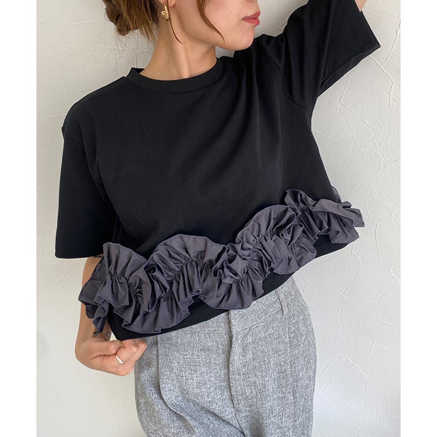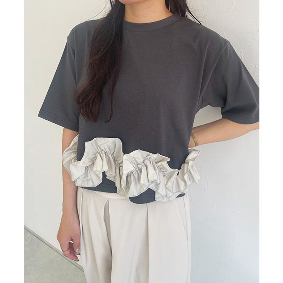 華やかなデザインながら、身頃には着心地の良いカットソー素材を使用し夏でも快適にお召しいただけます。裾のフリルはハリ感のある布帛を使用しシルエットが崩れにくいのも魅力です。
