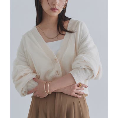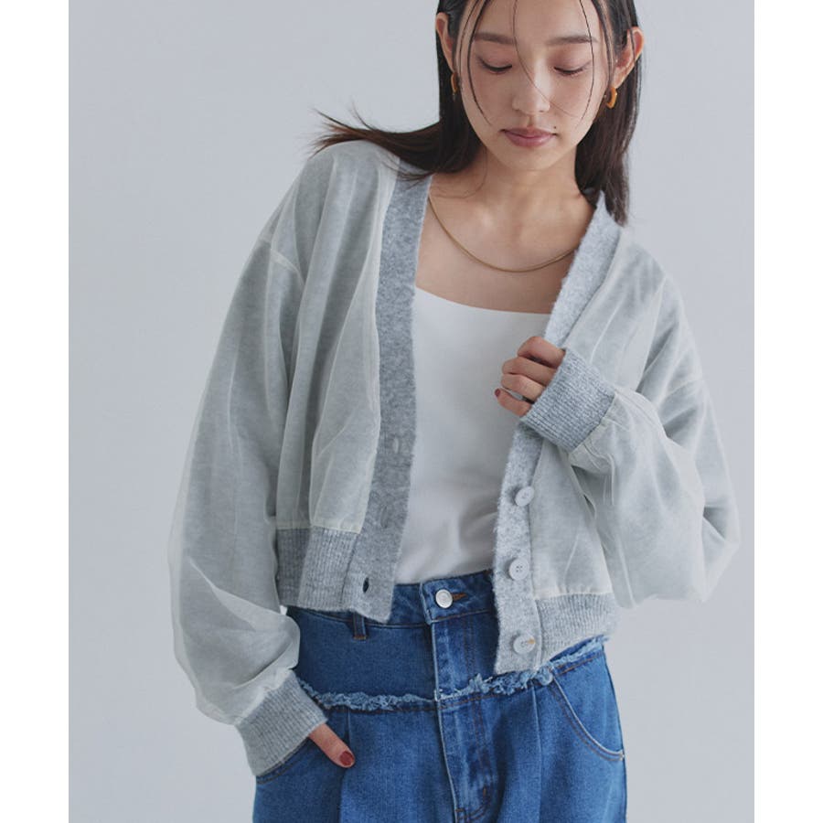 チュールレイヤードのデザインが着映え感を引き立てるニットカーディガン。クロップド丈が旬バランスを作り出します。首元はVネックですっきりと抜け感をプラスしました。