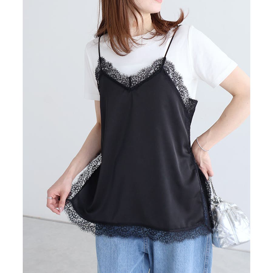 サテンレースキャミソール 光沢 胸元