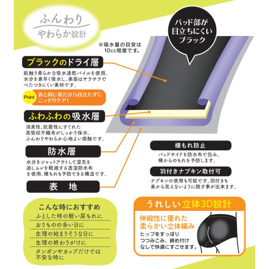 シークレットケア 吸水ショーツ 浅履きタイプ 単品( サニタリー 消臭抗菌 吸水速乾 羽付きナプキン取付可 軽失禁ショーツ 軽失禁パンツ 産後 生理用ショーツ ブラック レディース 生理用 黒 快適下着 ランジェリー インナー パンツ パンティー パンティ