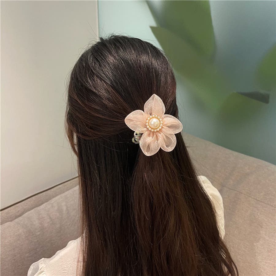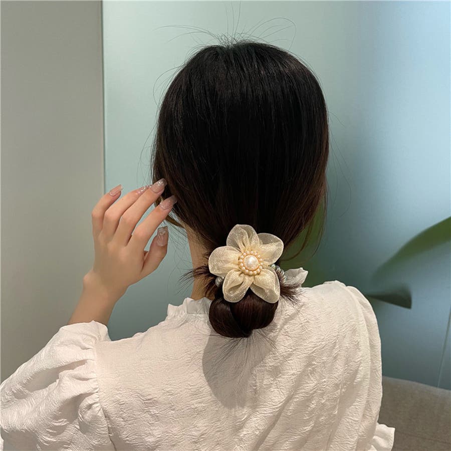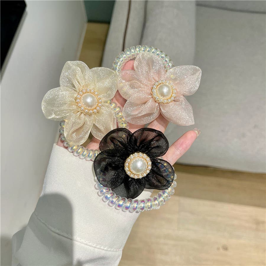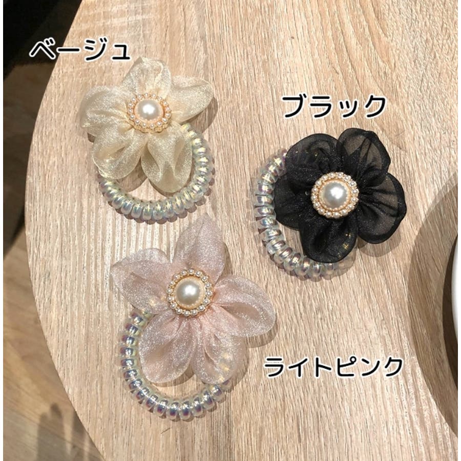 キラキラのチュール生地のお花にフェイクパールが上品な雰囲気のスプリングゴム。