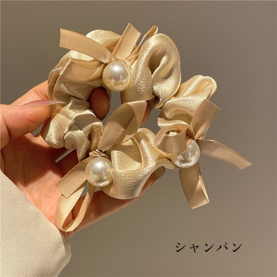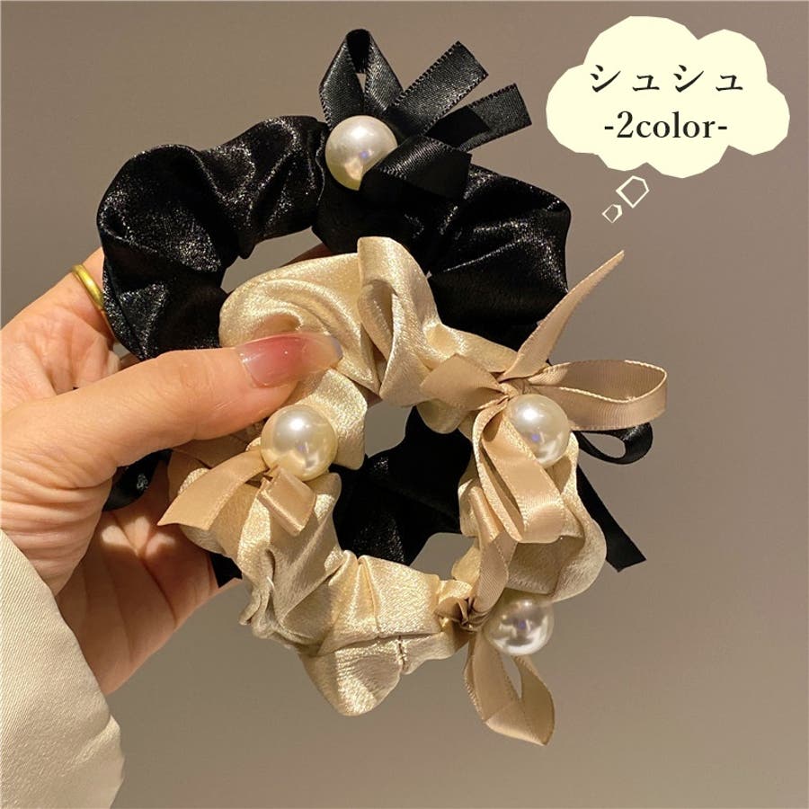 リボンとフェイスパールをあしらったレディース用のシュシュです。