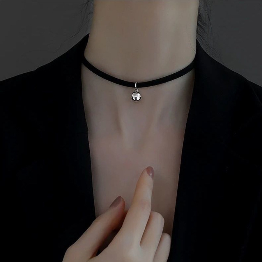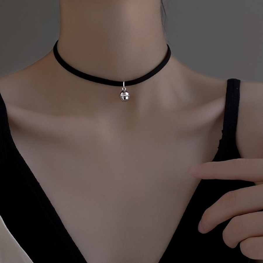 黒いネックレスと銀色の鈴が、かわいらしくもカッコよくも見えます。