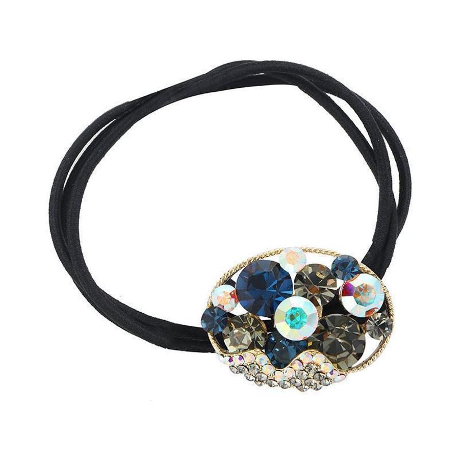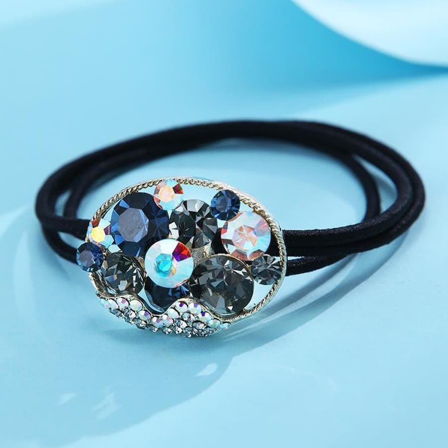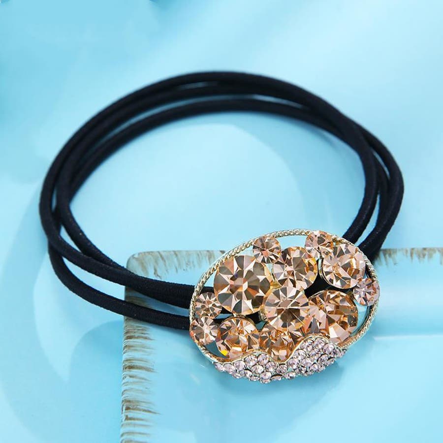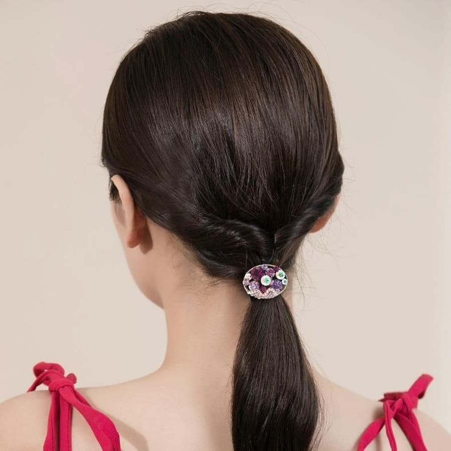 写真よりも少し小ぶりに感じます。輝きはもっとゴージャス。ラインストーンもゴムも頑丈です。ハーフアップにします。