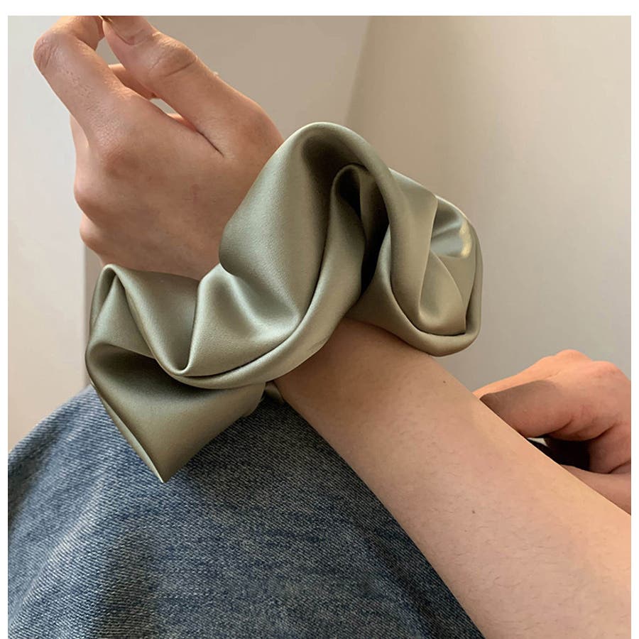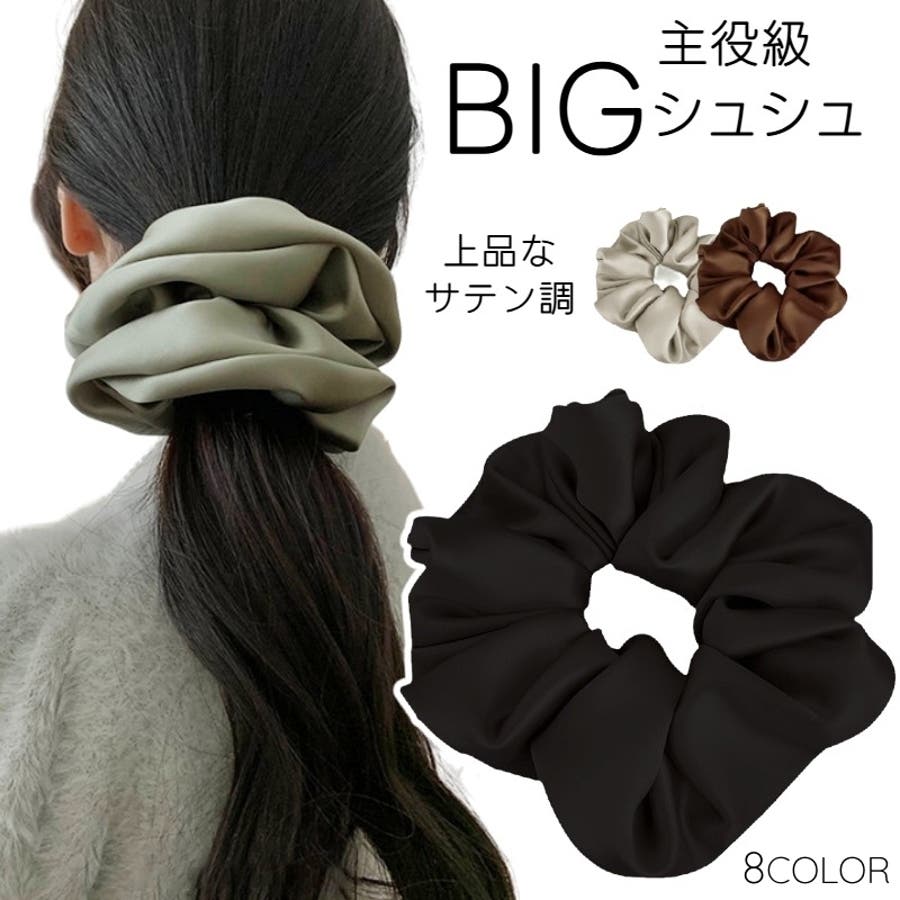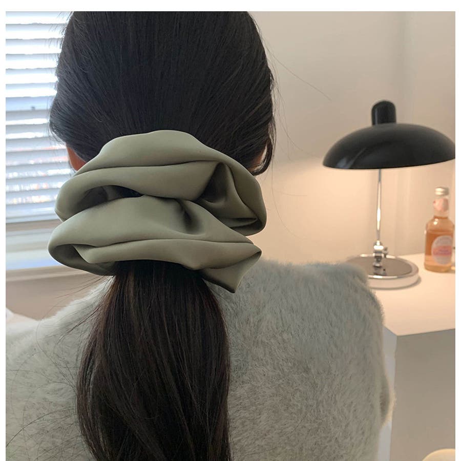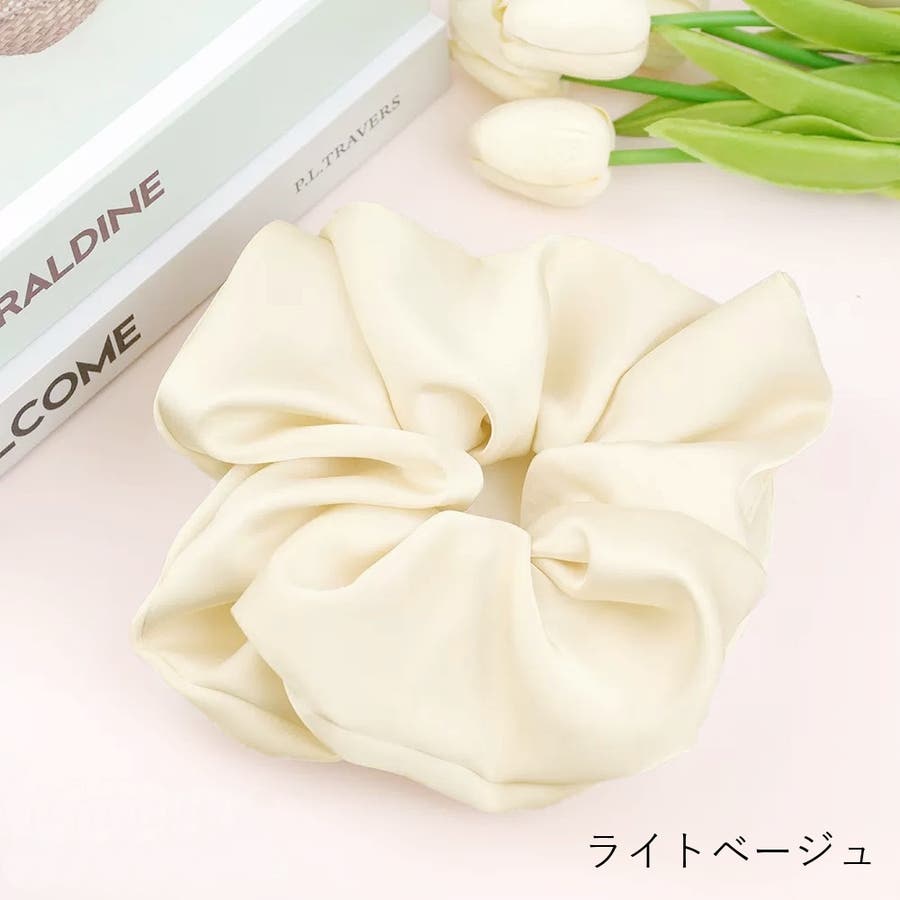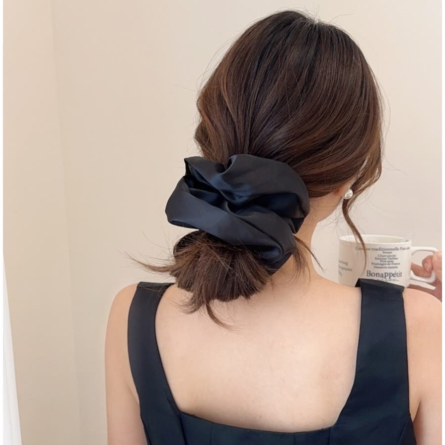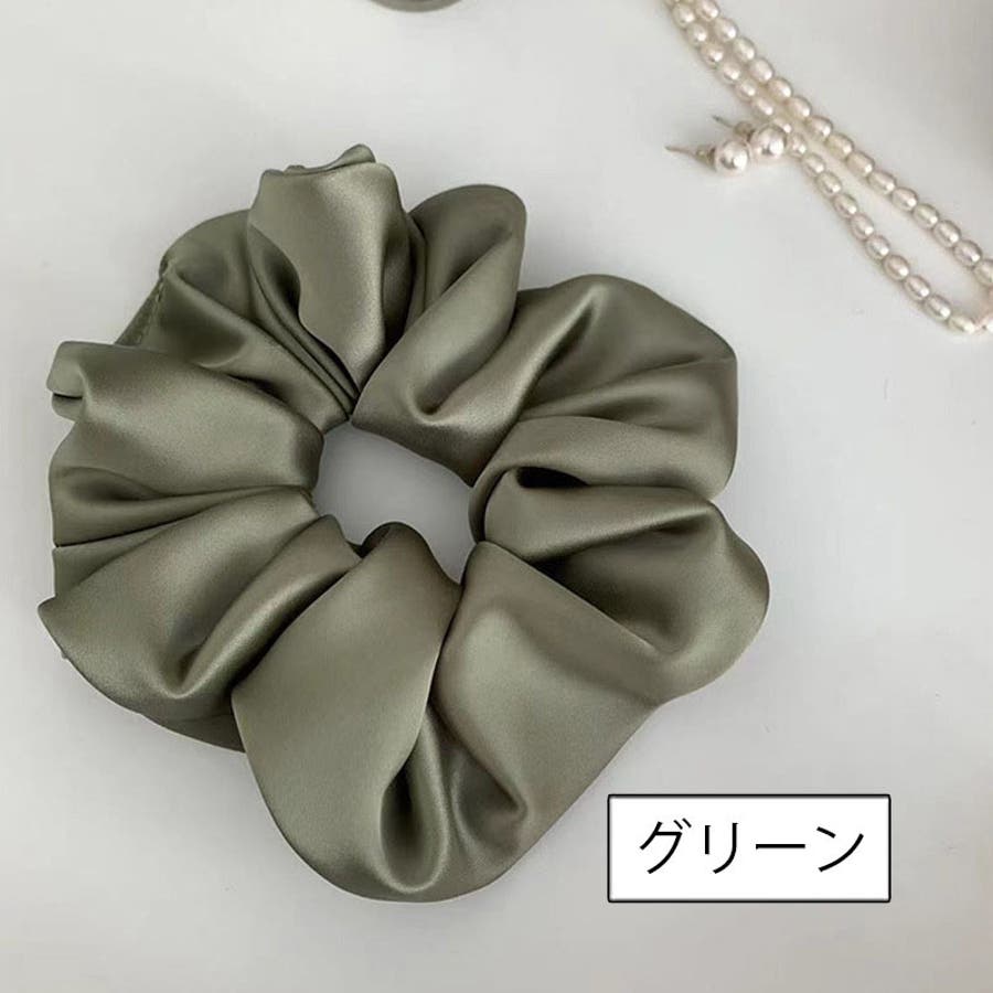 シンプルでありながら女性らしい華やかな印象にしてくれるサテン調シュシュ。