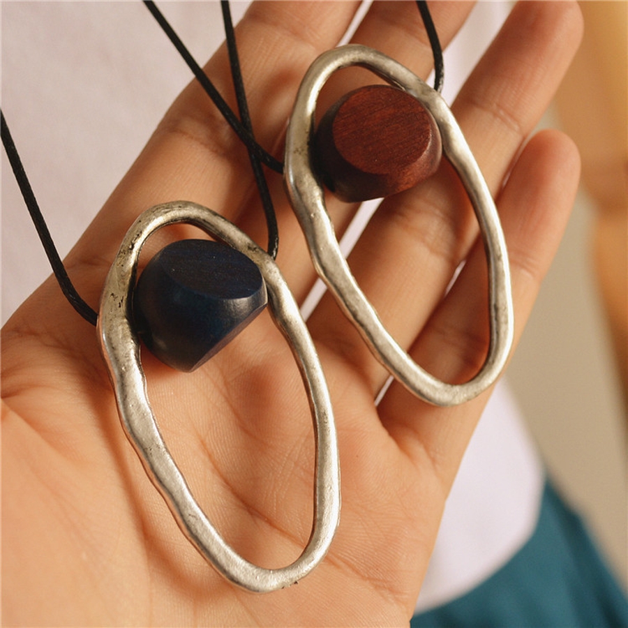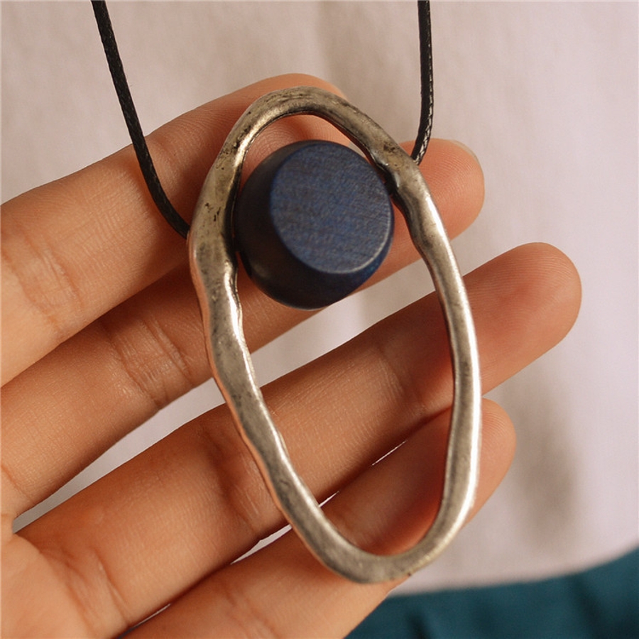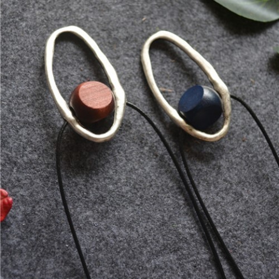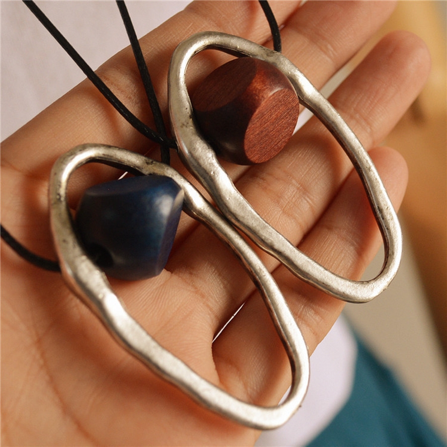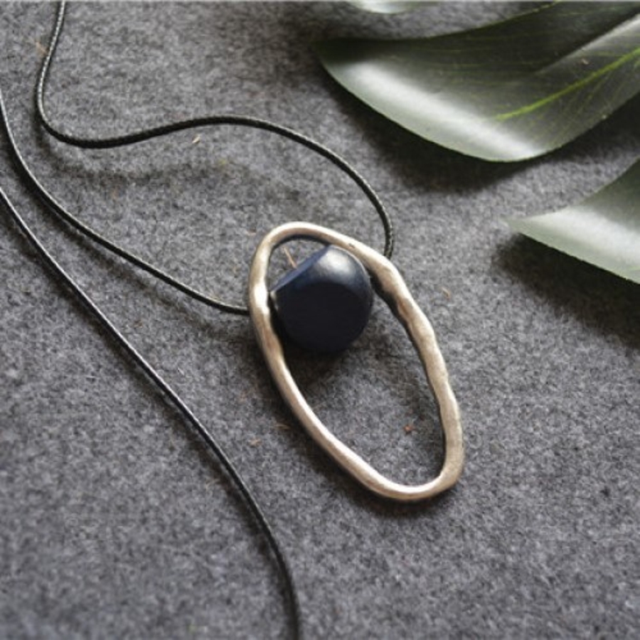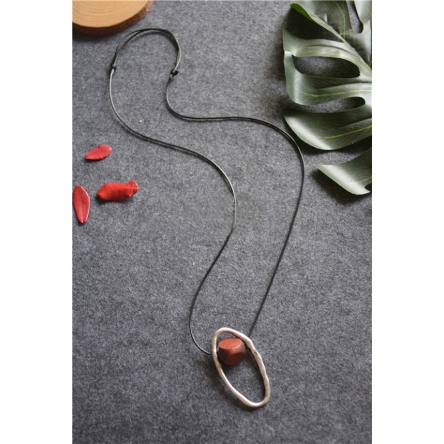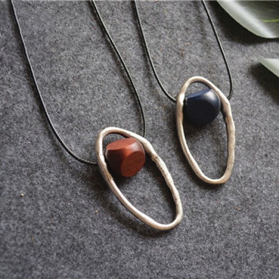 木製ビーズと、手作り風の外枠のついたペンダントトップがナチュラルな印象。