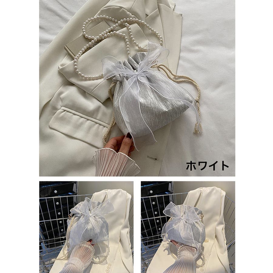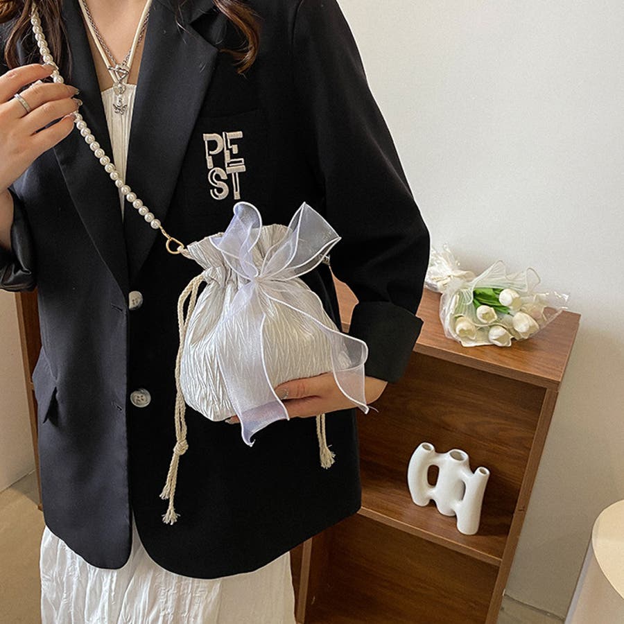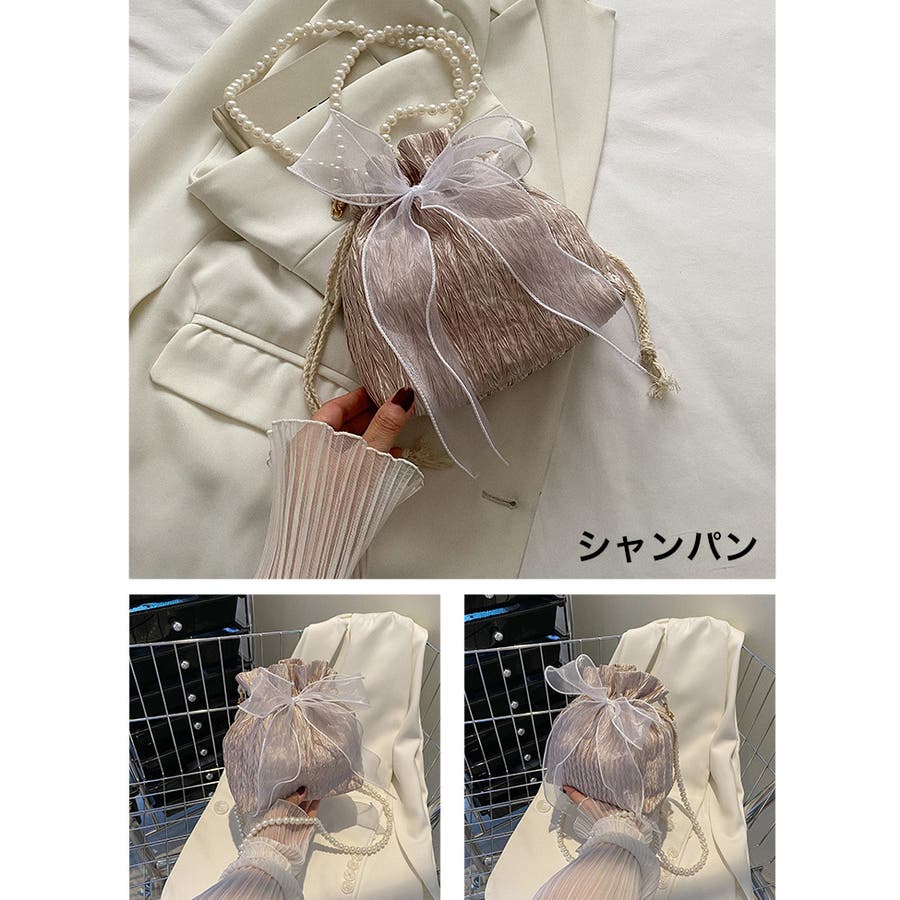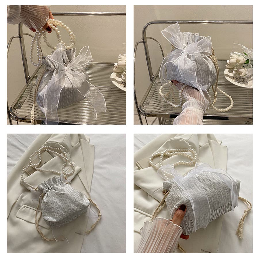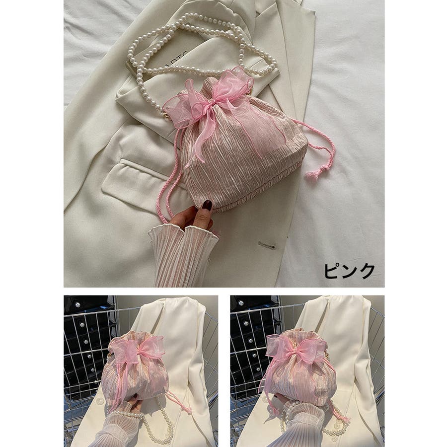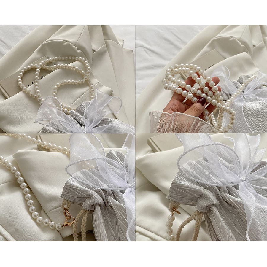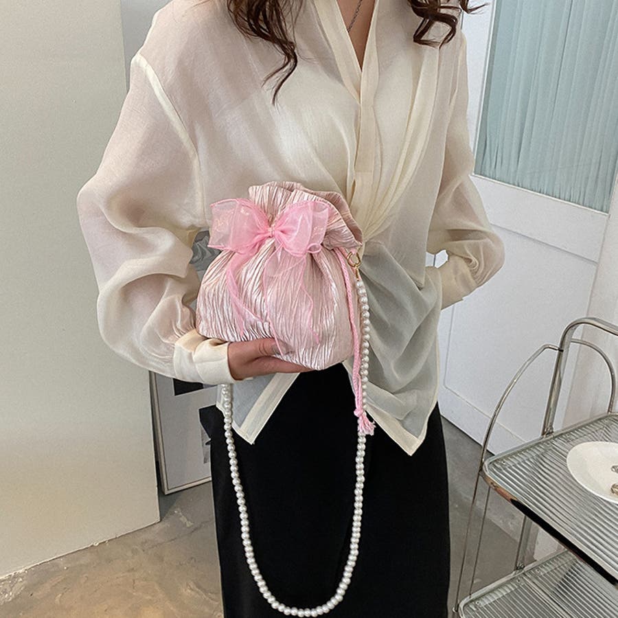 フェイクパールのチェーンと大きなリボンがアクセントに♪