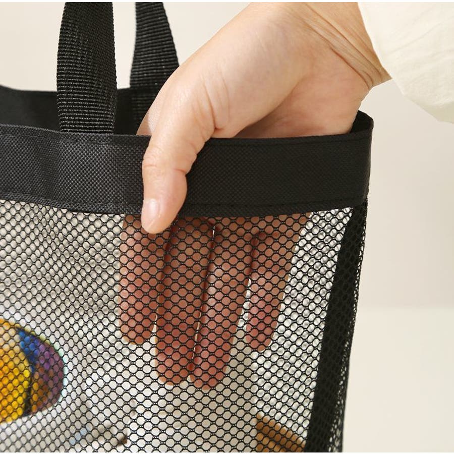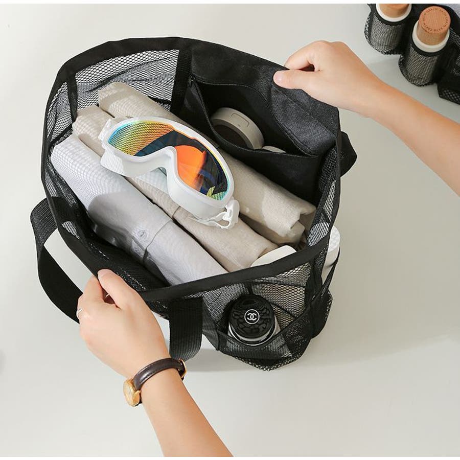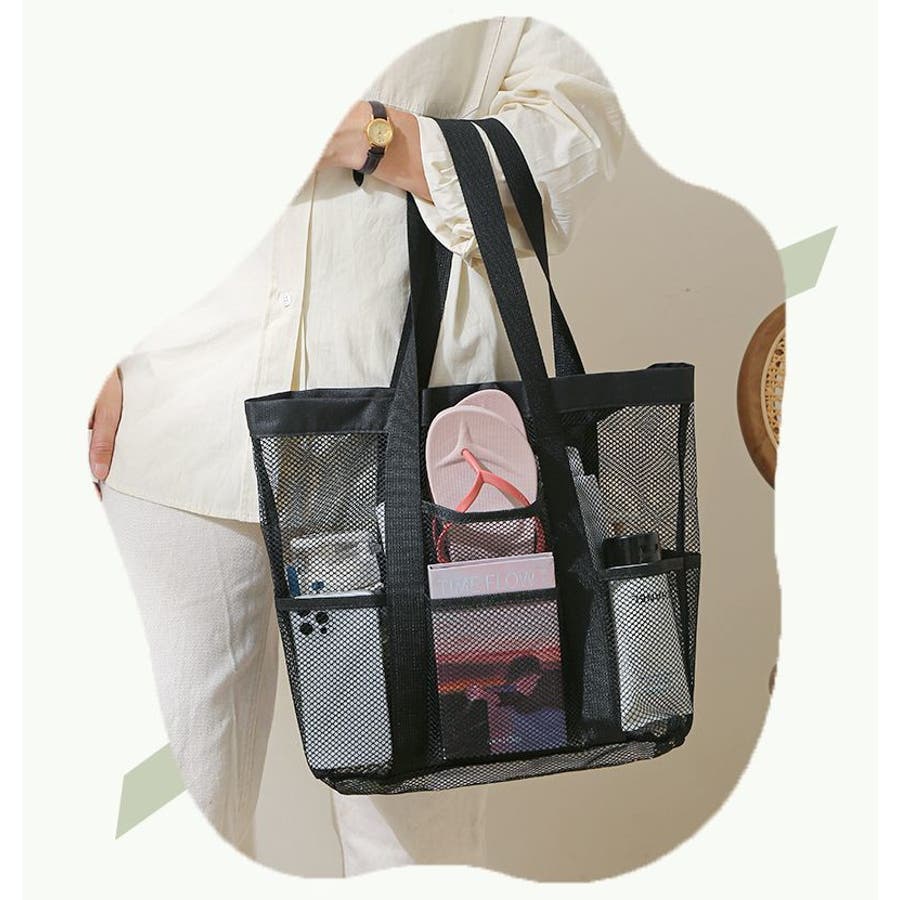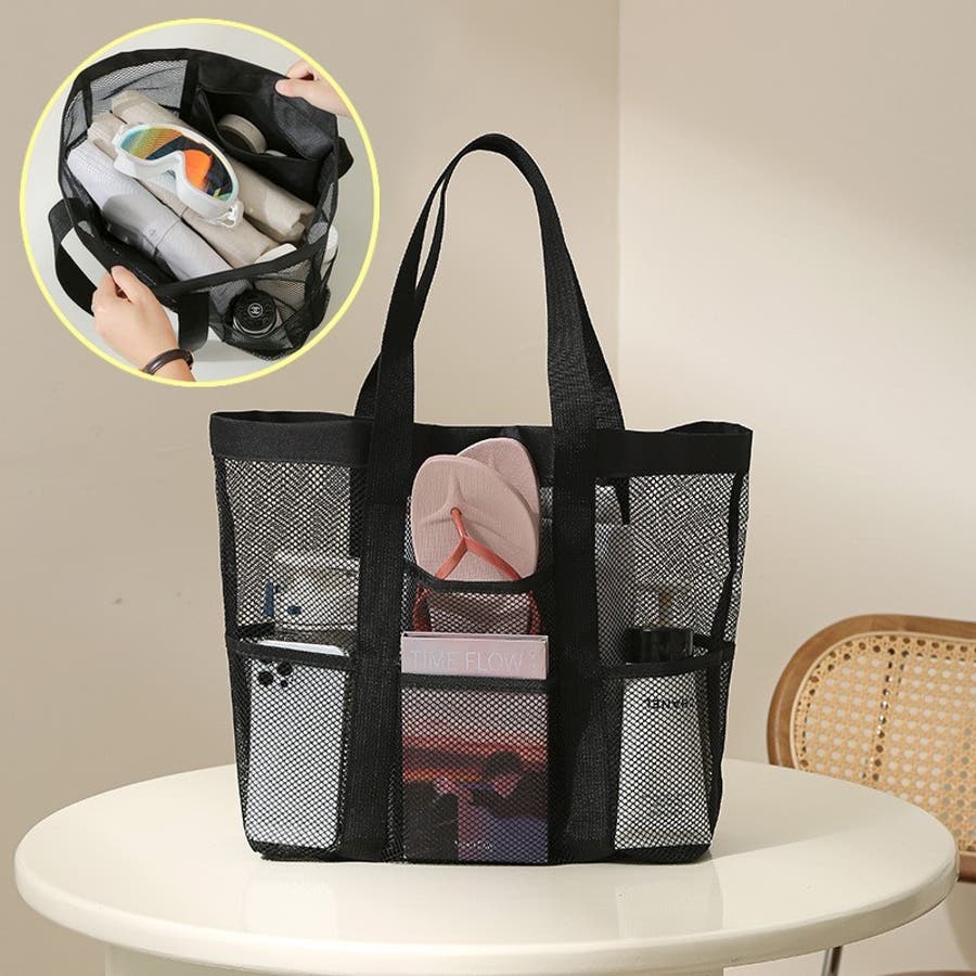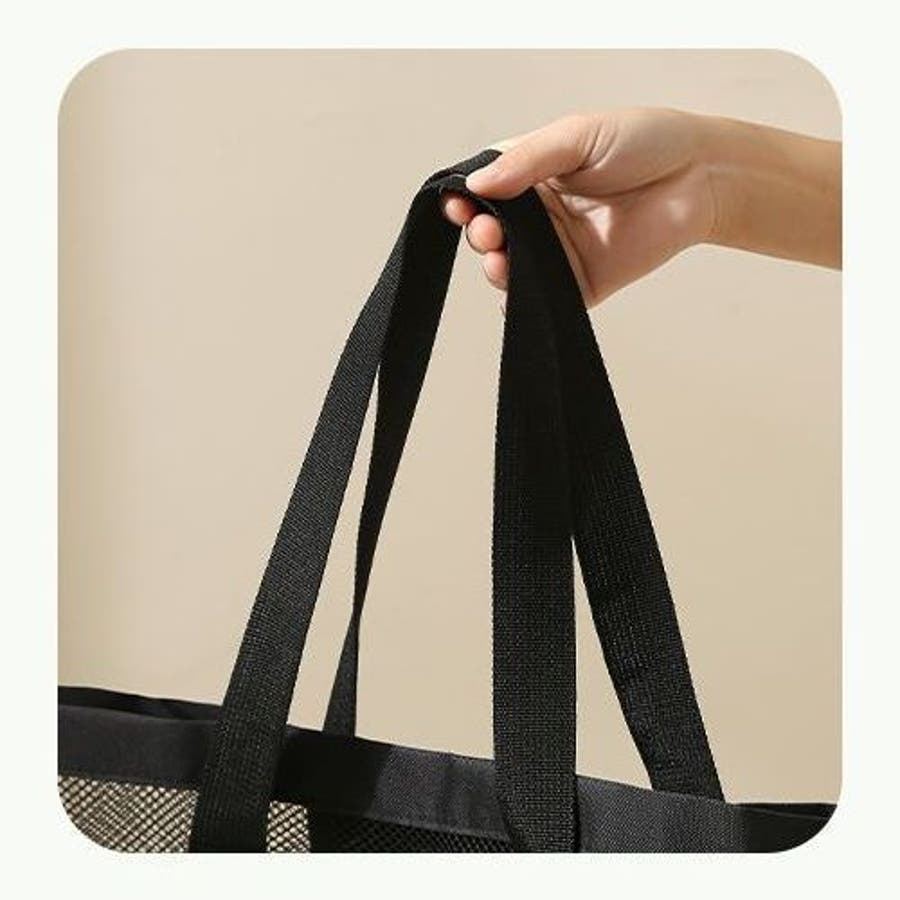 中身が見えて使いやすいマチ幅広めのメッシュトートバッグです。