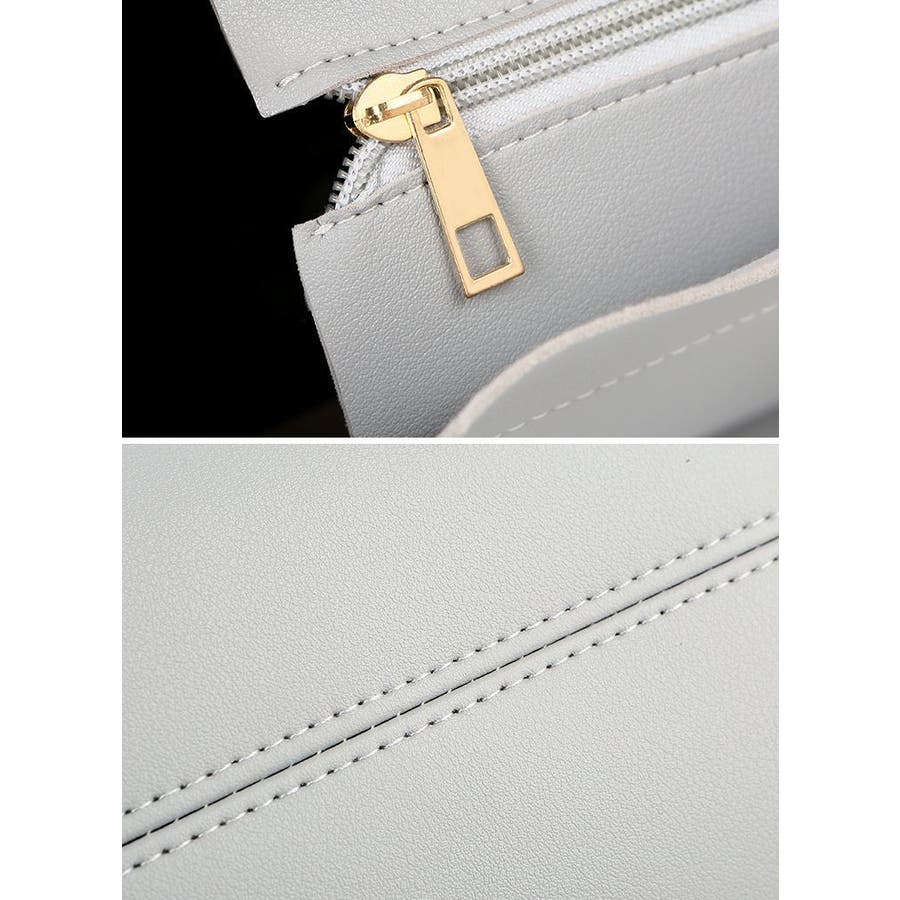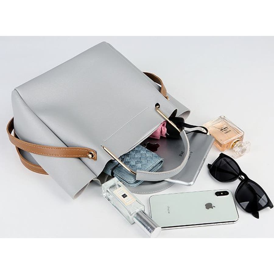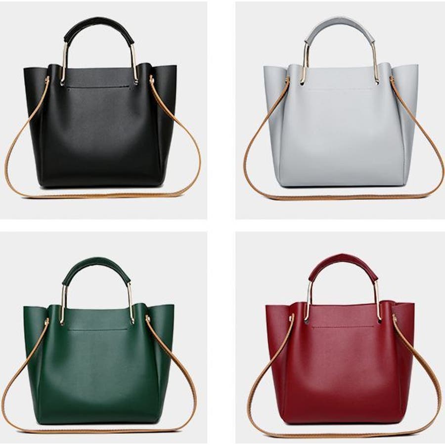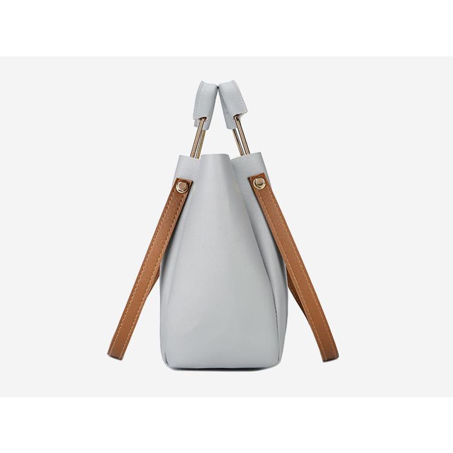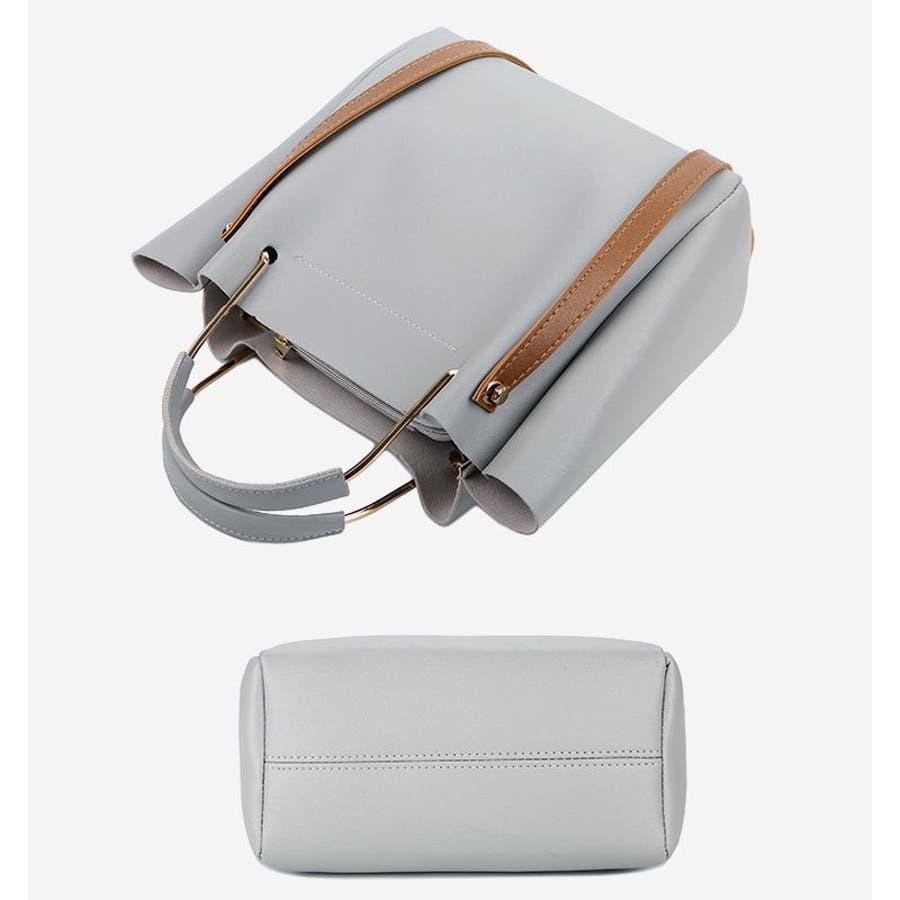 グレーの色味です。価格も安価でしたが生地もしっかりしております。持ち手は金具があります。