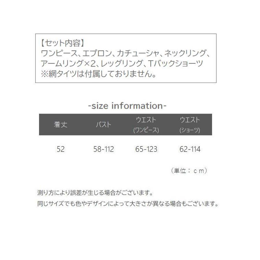 ワンピース、エプロン、カチューシャ、ネックリング、アームリング×2、レッグリング、Tバックショーツ
