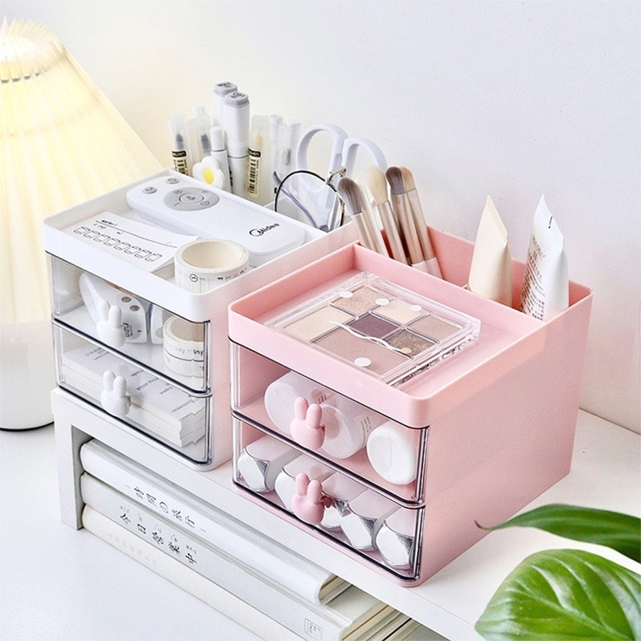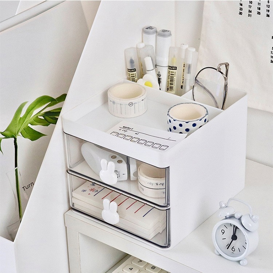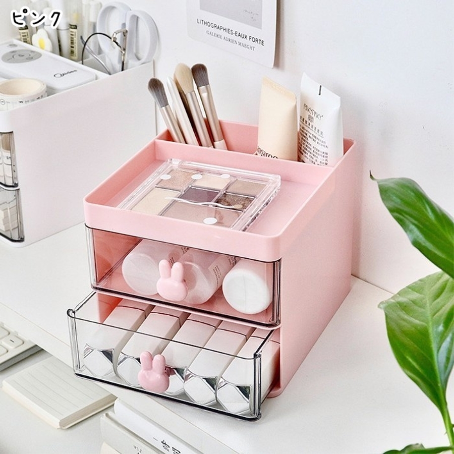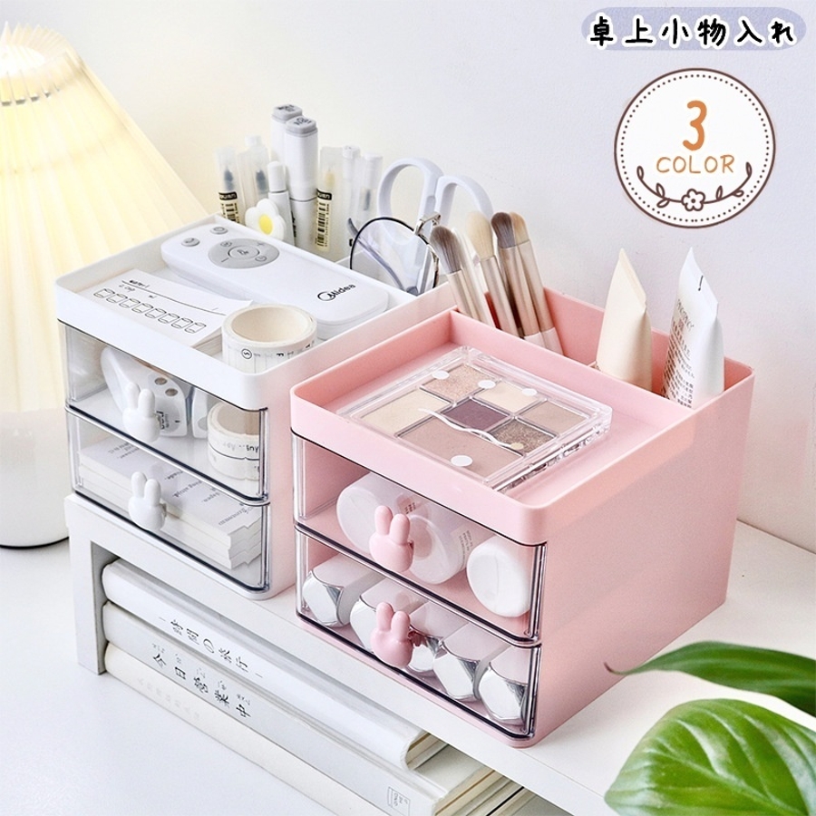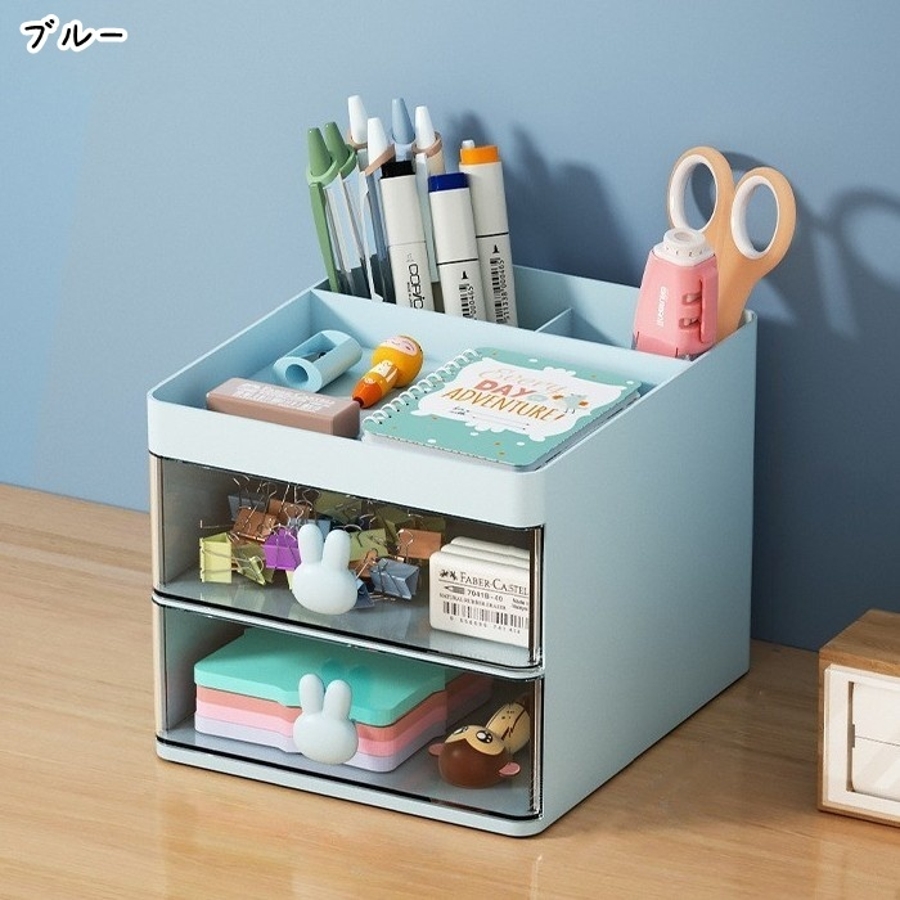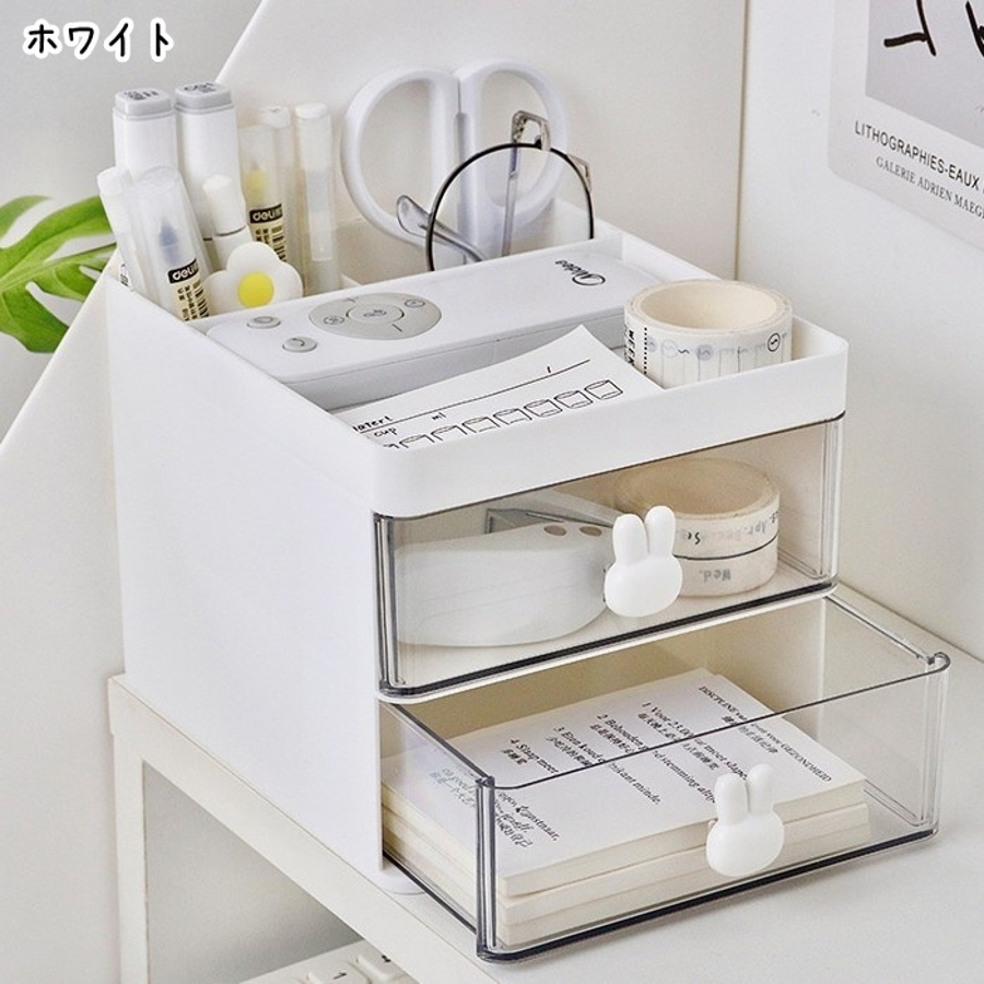 引き出しの他、上部はトレー、背面はペン立てになっていて、