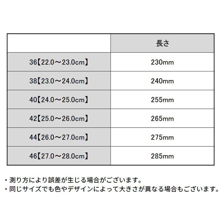 | サイズ | 36【22.0~23.0cm】 / 38【23.0~24.0cm】 / 40【24.0~25.0cm】 / 42【25.0~26.0cm】 / 44【26.0~27.0cm】 / 46【27.0~28.0cm】 |