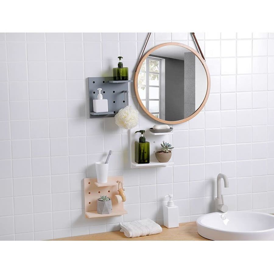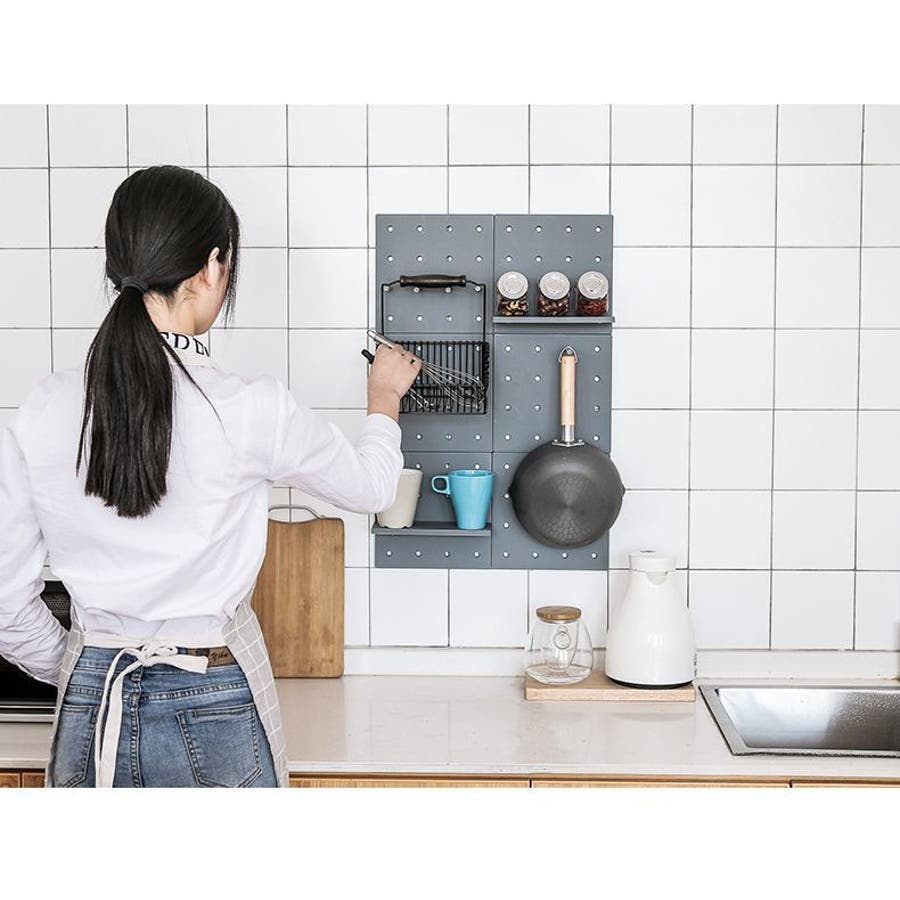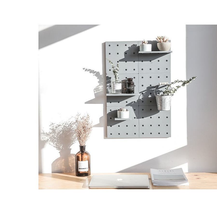 有孔ボードでフックや小物を掛けたり、棚に置いたりして、自由にディスプレイを楽しめます◎