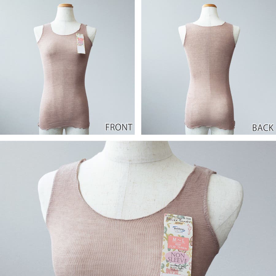 袖がないので様々なコーディネートに合わせやすく、重ね着にも最適。M~Lの共通サイズで幅広い体型に対応します。